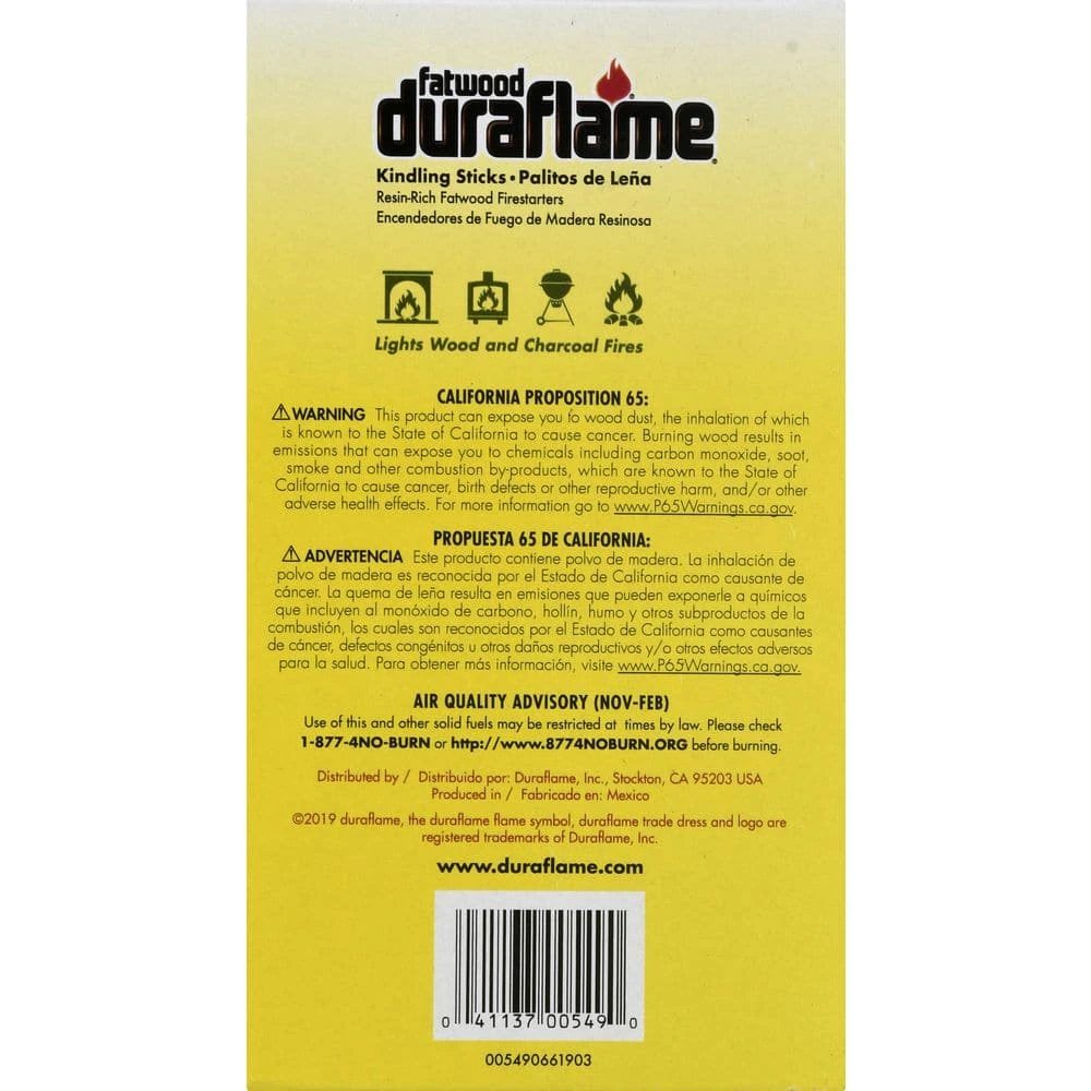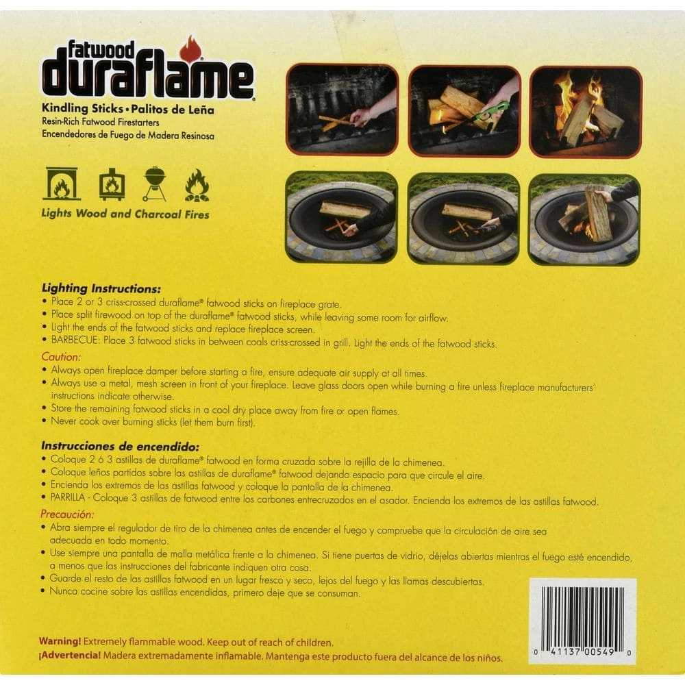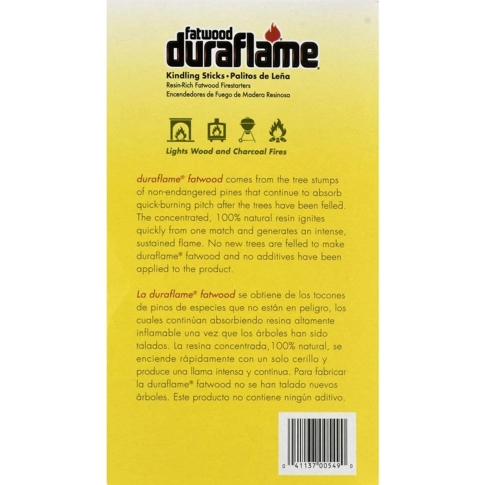 Duraflame fatwood comes from the tree stumps of non-endangered pines that continue to absorb quick-burning pitch after the trees have been felled. The concentrated, 100% natural resin ignites quickly from 1 match and generates an intense, sustained flame. No new trees are cut down and no additives have been applied to the product. Duraflame fatwood is both user and environment friendly.