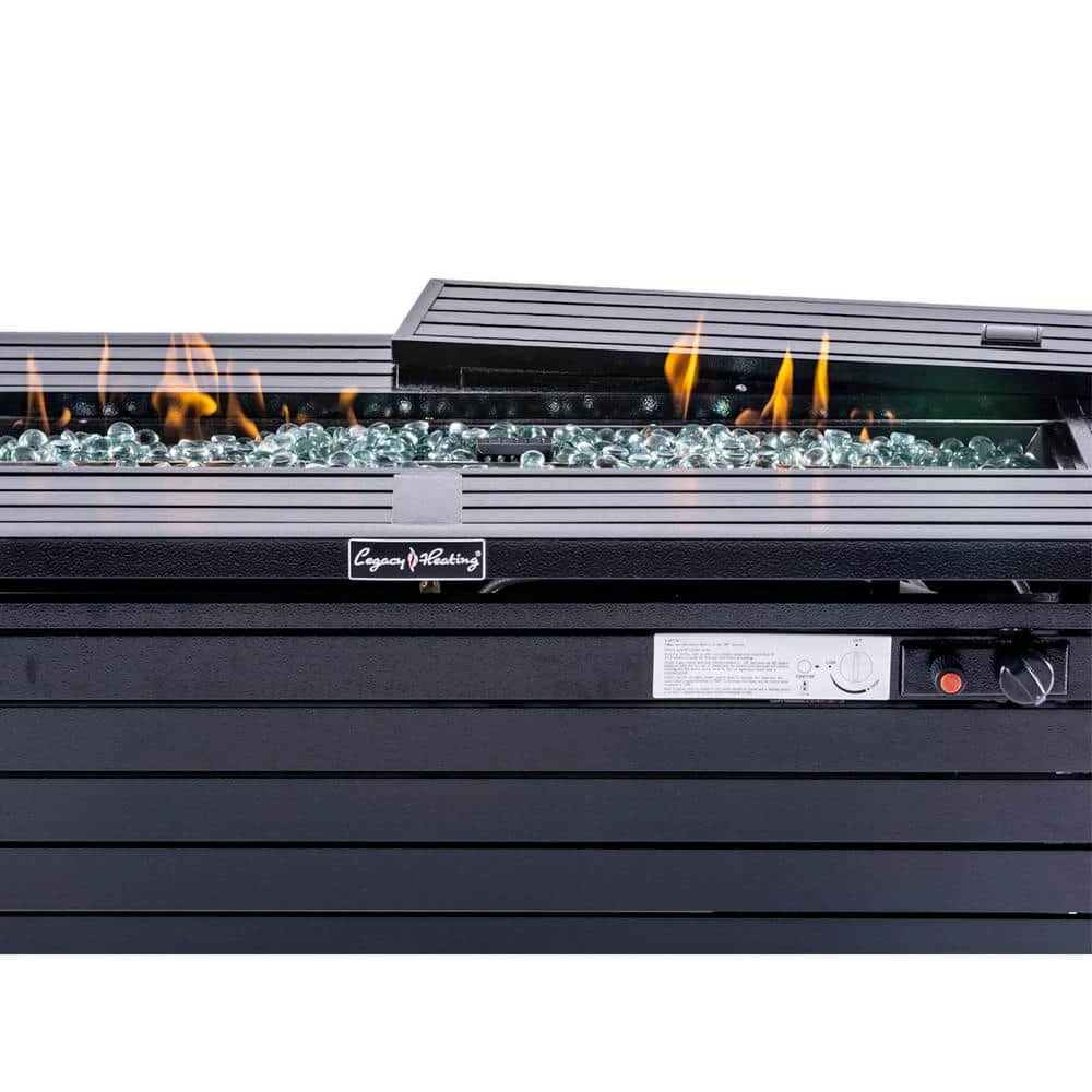 The Legacy Heating Rectangular Fire Pit with Cover is a versatile piece of patio furniture that you’ll find yourself using all year round. The frame is built from sturdy steel, protected from the elements by an hammered black finish and designed with steel bar look. A standard 20lbs. liquid propane tank (stored inside, tank not included) is all you need to produce up to 50,000 BTUs of warmth from the stainless-steel burner. A bag of clear fire glass is included. A weather-resistant cover is included for longer-term protection.