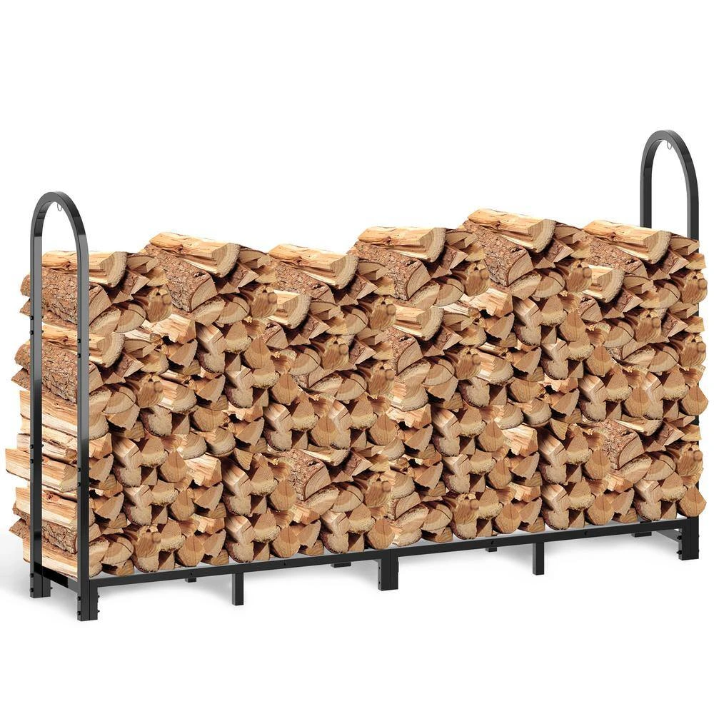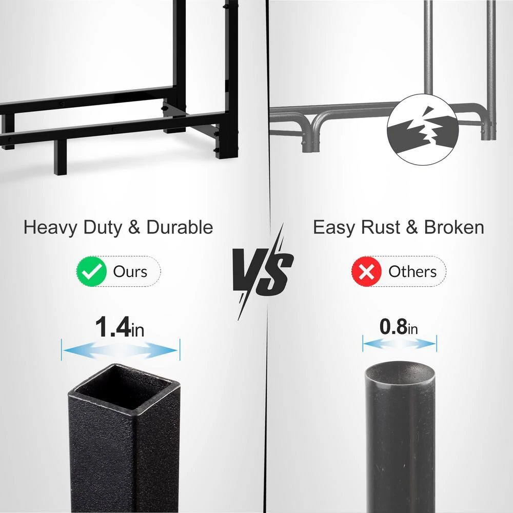 - Heavy-duty and durable: the firewood storage holder is made of heavy tubular steel construction with a black powder-coated finish, welds are even and looking overall, it has optimal durability, sturdy, rustproof, and weather fastness, it can hold enough wood for the fireplace in all seasons, features 2 lock rings and 10 solid rack legs, secure the rack reliably and effectively prevent tipping over of the heavy firewoods, just lock up the rack with extra straps and put the rack on a hard surface