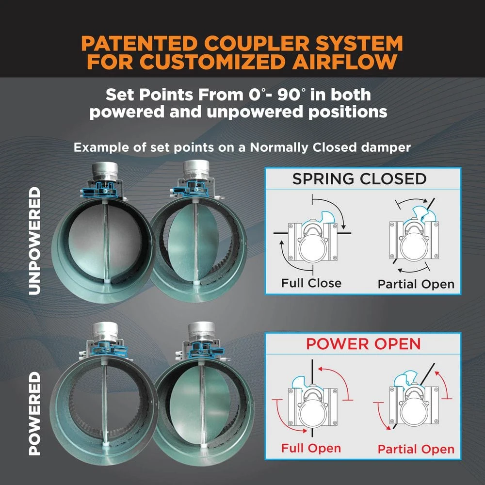The Zone Master Motorized Adjustable Damper controls airflow in an HVAC system or fresh air intake. Available as power closed/spring return or power open/spring return. Adjustable close or open position range stops. Easy to wire, 2-wire installation. Save energy by controlling airflow.