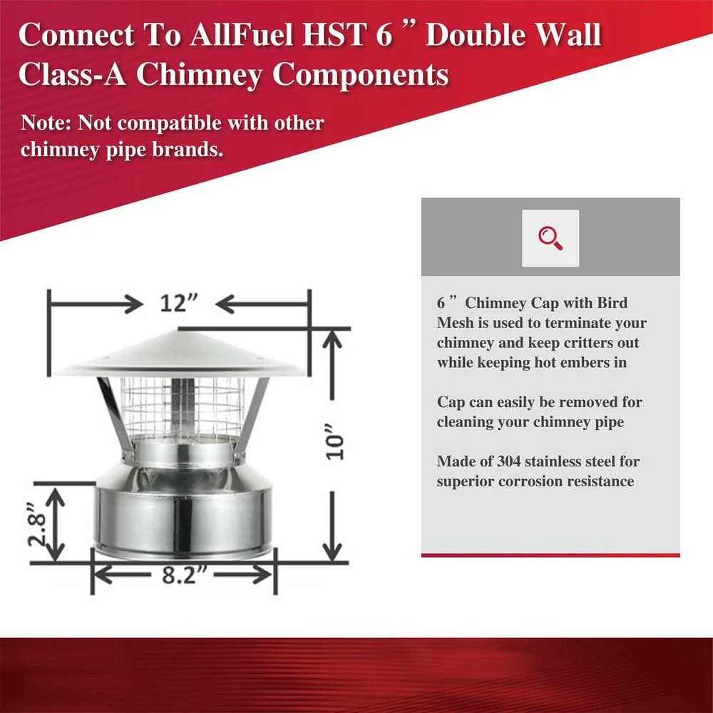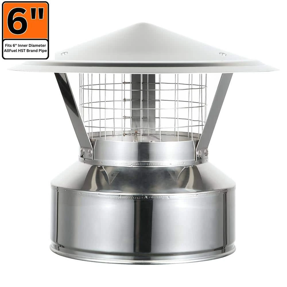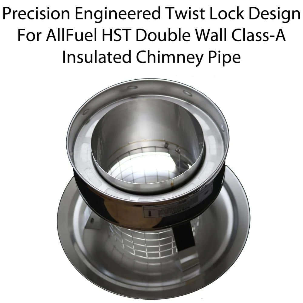 The rain cap with spark arrester tops off the chimney system to retain sparks and hot embers from escaping the chimney as well as to keep rain and snow, debris, and animals from getting inside the chimney. Our chimney cap uses the same twist lock connection as the rest of our products to allow easy removal for cleaning. The spark guard mesh measures 3/4 in. to block hot embers from escaping but not being so small that it will clog up from creosote and ash. Note: 3/4 in. mesh is not approved for use in California which requires 5/8 in. mesh.