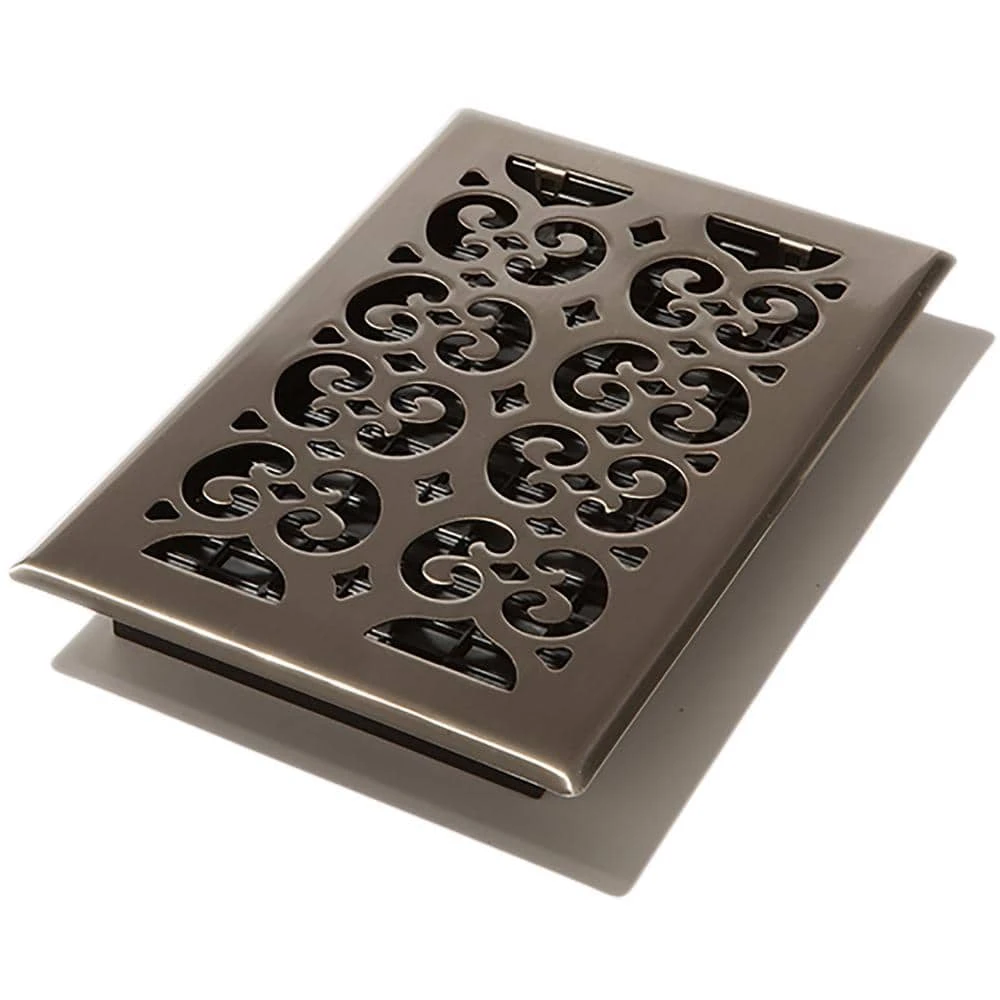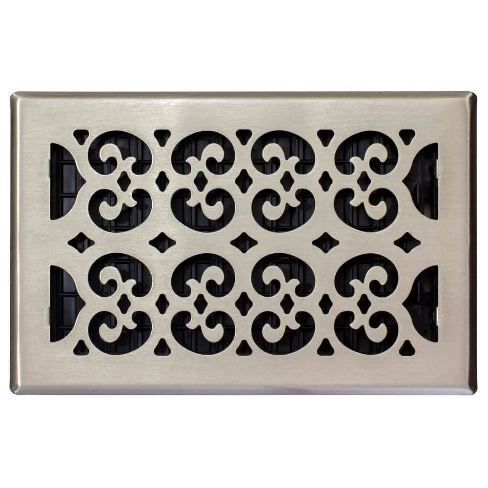 The 6 in. x 10 in. Scroll Design Steel Floor Register is an elegant addition to any home decor. The brushed nickel finish has a lacquered coating for added protection. The damper box is made from a high impact plastic, not metal which can rust and seize up. This is not a cheaper option, it’s the best option. The register fits a 6 in. x 10 in. opening.