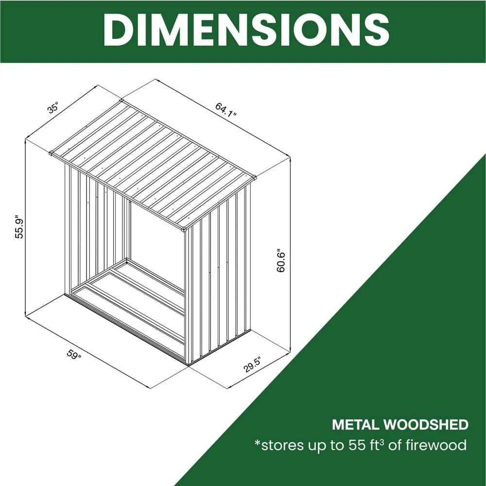- Dimensions: 27.5 in. D x 57 in. W x 59 in. H interior dimensions, 35 in. D x 64 in. W x 61 in. H exterior dimensions – stores up to 55 cu. ft. of stack firewood