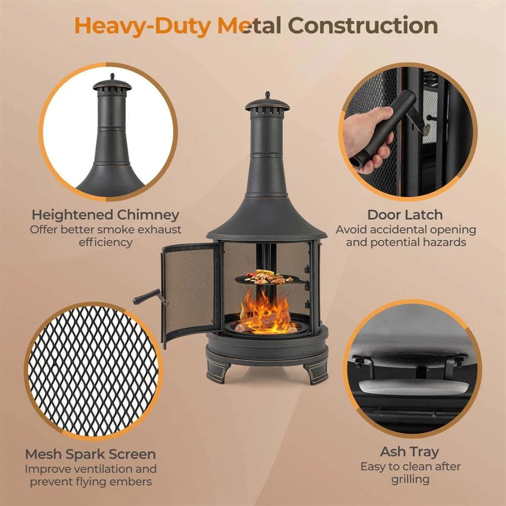 - 2-in-1 multi-functional design: you will elevate your outdoor gatherings with this versatile fire pit that doubles as a BBQ grill, suitable for year-round use, featuring a heightened chimney, this chimenea diverts the smoke up and allows smoke rise straight, creating a comfortable environment for guest