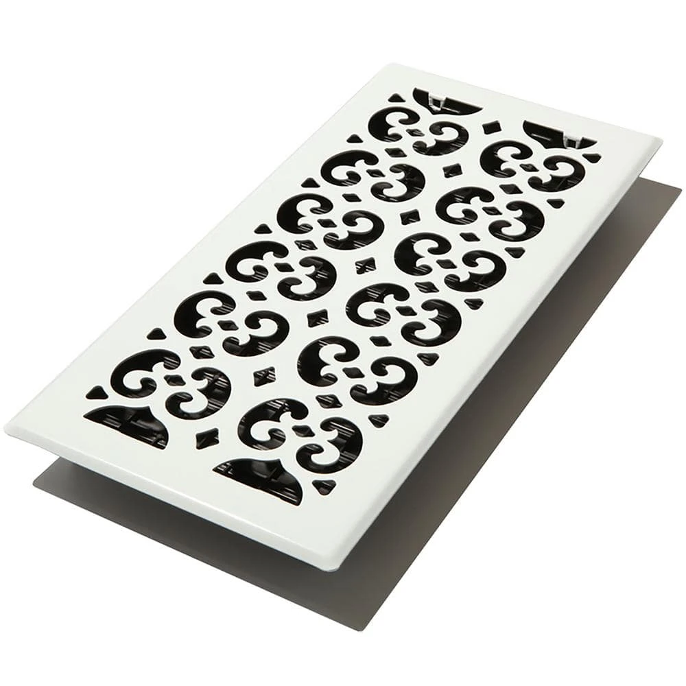 The 6 in. x 14 in. Scroll Design Steel Floor Register is an elegant addition to any home decor. The painted white finish has a lacquered coating for added protection. The damper box is made from a high impact plastic, not metal which can rust and seize up. This is not a cheaper option, it’s the best option. The register fits a 6 in. x 14 in. opening.