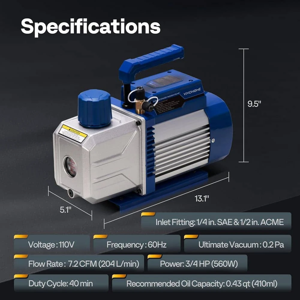 The VIVOHOME dual stage rotary vane vacuum pump features an ignition-proof switch and sparkless motor for safe operation with A2L refrigerants like R32 and R1234yf. Powered by a 3/4 HP (560W) motor running at 3456 r/min, it delivers 7.2 CFM airflow and achieves 0.2 Pa vacuum in just 3 minutes-ideal for precise HVAC system evacuation. Features dual 1/2 in. ACME and 1/4 in. SAE ports, plus four adapters (2x 1/4 in. male to 5/16 in. female for R410a, 1x 1/4 in. male to 1/2 in. female, and 1x 1/4 in. male to 1/2 in. female left-hand) for R32, R1234yf, R410a, R134a, R12, R22, and R502 air conditioning systems.