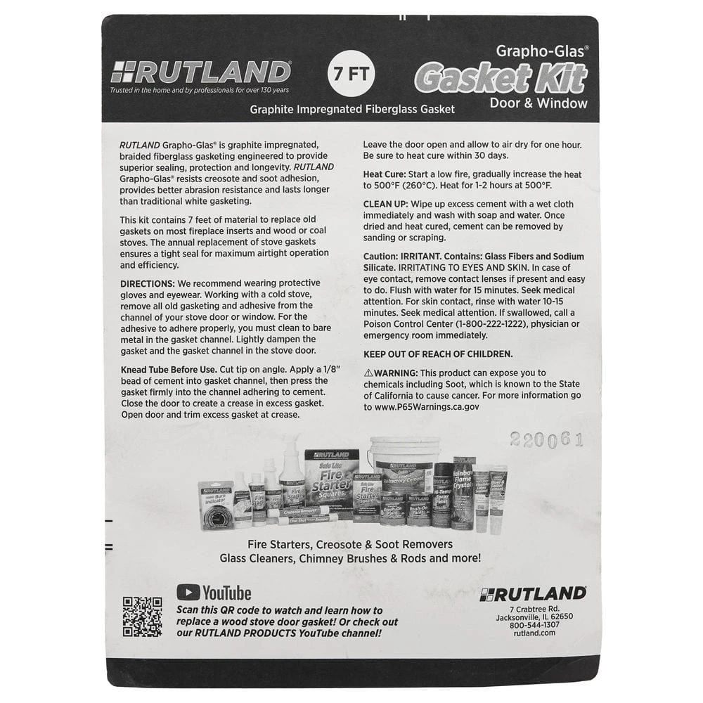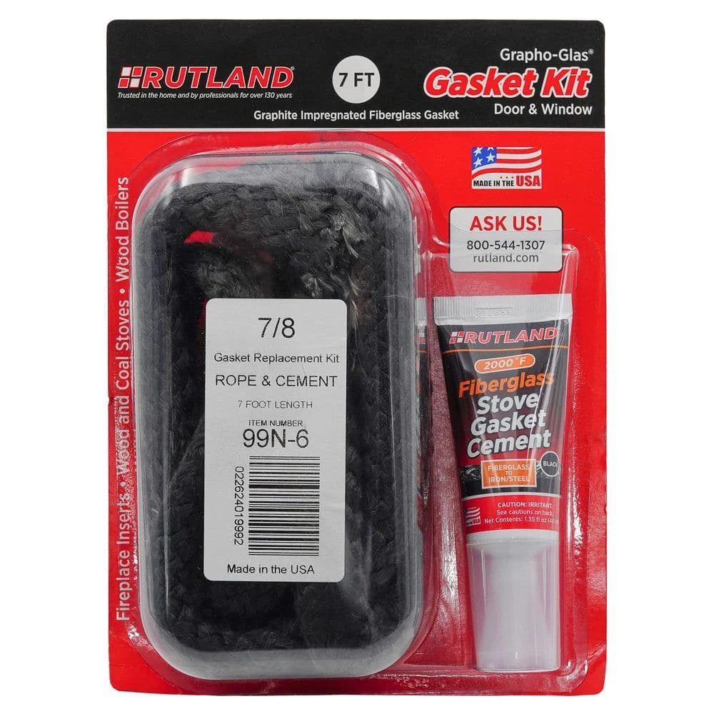 RUTLAND Grapho-Glas Stove Gasket Kits include both high-quality gasketing in convenient rope or tape, plus cement to allow the DIY homeowner to confidently replace worn-out gaskets in wood stoves, coal stoves, and fireplace inserts. This graphite-impregnated gasketing resists abrasion, creosote adhesion, and temperatures up to 1000ºF, and is braided to resist fraying. Kit also contains 1.35 oz tube of RUTLAND E-Z Spread Fiberglass Stove Gasket Cement to securely attach the provided gasketing.