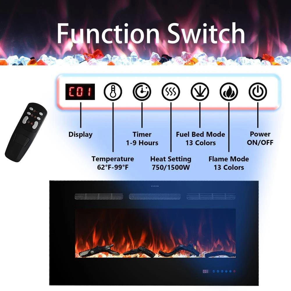 - Thermostat and timer: 62°F to 89°F temperature modes and 1-hours to 9-hours timing setting, the electric fireplace will automatically turn off when reach the set temperature and time