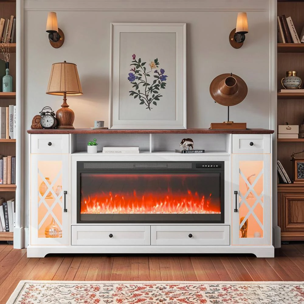 VEVOR Fireplace TV Stand-A Romantic and Relaxing Entertainment Space. The VEVOR Fireplace TV Stand delivers robust 1400W heating, covering an area up to 4777 BTU (323 sq. ft.). It comes with a remote control that operates within a range of 6-9 m, allowing adjustable temperature settings, a timer function ranging from 9 hours, and 5 flame settings. Constructed from high-quality PB+MDF with a wood veneer, iron and glass, it supports up to 300 lbs. (136.08 kg). This versatile unit is suitable for various settings, including living rooms, bedrooms, and offices, and can serve as a TV stand, storage cabinet, or nightstand.