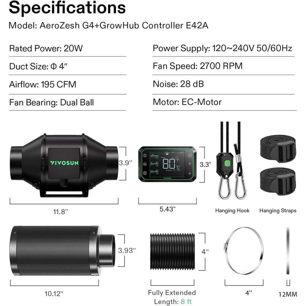 - Perfect smart combination: includes aerozesh G4, 4 in., inline duct fan, growhub E42a controller, 4 in. black carbon filter and 4 in. 8 ft. black ducting
