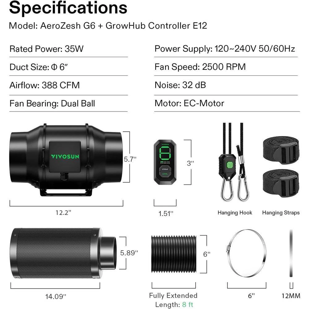 - Efficient cooling and ventilation kit: includes AeroZesh G6, 6 in., inline duct fan, E12 speed controller, 6 in. black carbon filter and 6 in. 8 ft. black ducting