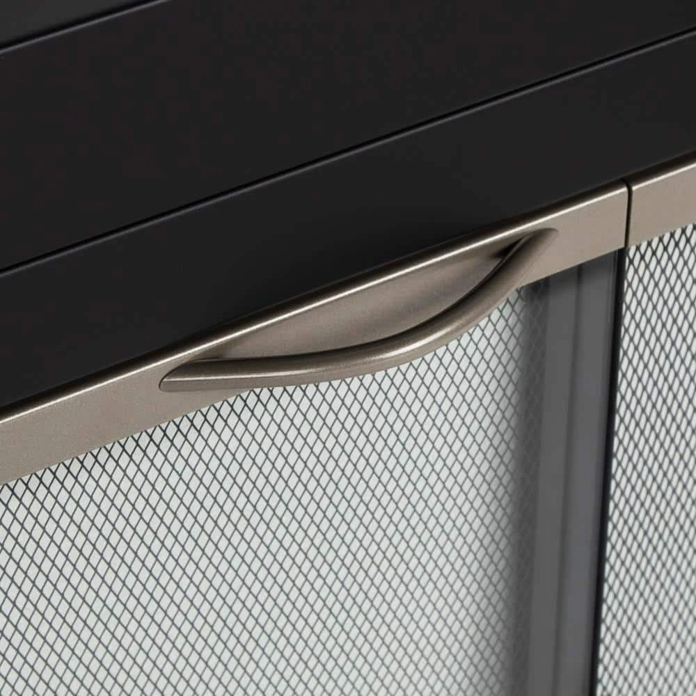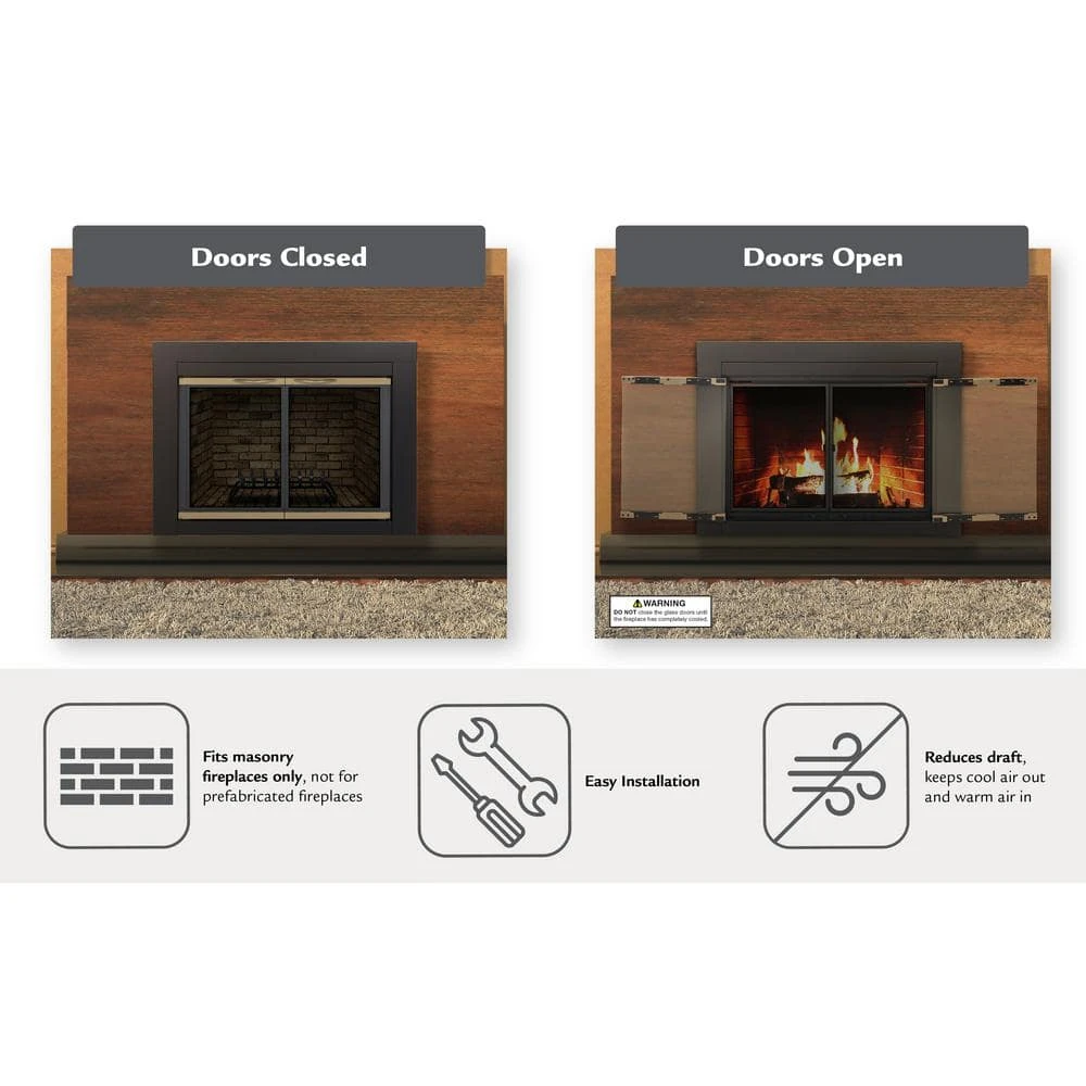 Boasting an art deco aesthetic, the Pleasant Hearth Alsip Fireplace Glass Door Collection is a beautiful, black, cabinet style, one-piece frame. When installed, the fireplace glass door enhances the appearance of your family’s indoor, wood-burning, traditional masonry fireplace hearth. All Pleasant Hearth Fireplace Glass Door sets are designed for masonry fireplaces only and are not compatible with prefabricated fireplaces – see our sizing guide for more details: (link to the FGD sizing guide on our site/reference its location for retailers)When it’s time to unwind from the day, glass door set opens completely, providing a clear view of your burning fire. The clear 3/16-in tempered glass doors must stay open while the fire is burning, and the built-in mesh firescreen panels act as a barrier to help contain embers. Both the glass doors and mesh panels have easy-catch magnets to help keep them closed.The glass doors can help you save energy year-round – when closed, they prevent AC and heat loss through the chimney by up to 90%. The hidden damper knob at the bottom of the firescreen provides additional air flow to feed the fire for bigger, longer-lasting flames. Closed fireplace glass door sets also prevent cold chimney downdrafts from entering your home and keep pets and children out of fireplace soot.