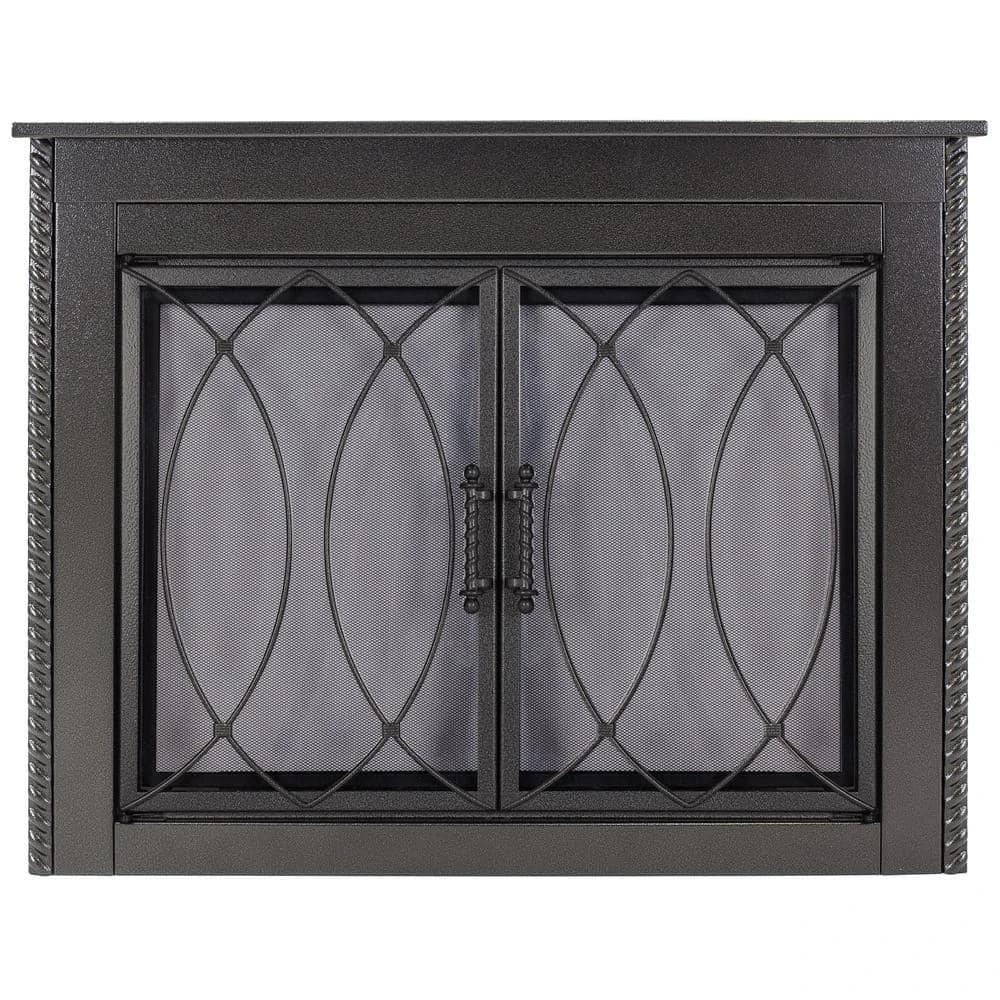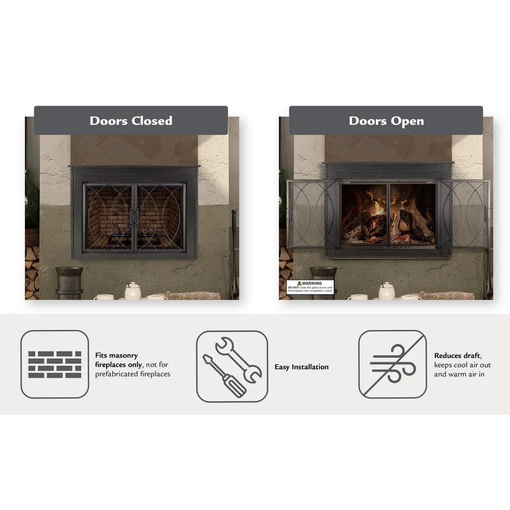 The Pleasant Hearth Amhearst Fireplace Glass Door Collection is a beautiful, hammered black, cabinet style, one-piece frame. When installed, the fireplace glass door enhances the appearance of your family’s indoor, wood-burning, traditional masonry fireplace hearth. All Pleasant Hearth Fireplace Glass Door sets are designed for masonry fireplaces only and are not compatible with prefabricated fireplaces – see our Sizing Guide for more details. The smoked 3/16-in tempered glass doors must stay open while the fire is burning, and the built-in mesh firescreen panels act as a barrier to help contain embers. Both the glass doors and mesh panels have easy-catch magnets to help keep them closed.The glass doors can help you save energy year-round – when closed, they prevent AC and heat loss through the chimney by up to 90%. The hidden damper knob at the bottom of the firescreen provides additional air flow to feed the fire for bigger, longer-lasting flames. Closed fireplace glass door sets also prevent cold chimney downdrafts from entering your home and keep pets and children out of fireplace soot.These fireplace glass doors are surface mounted flat against the fire place opening, allowing the doors to open fully to provide an incredible view of your fire from anywhere in the room. Pleasant Hearth has guided instructions on how to install your new fireplace glass doors in both the Product Manual and Installation Video.