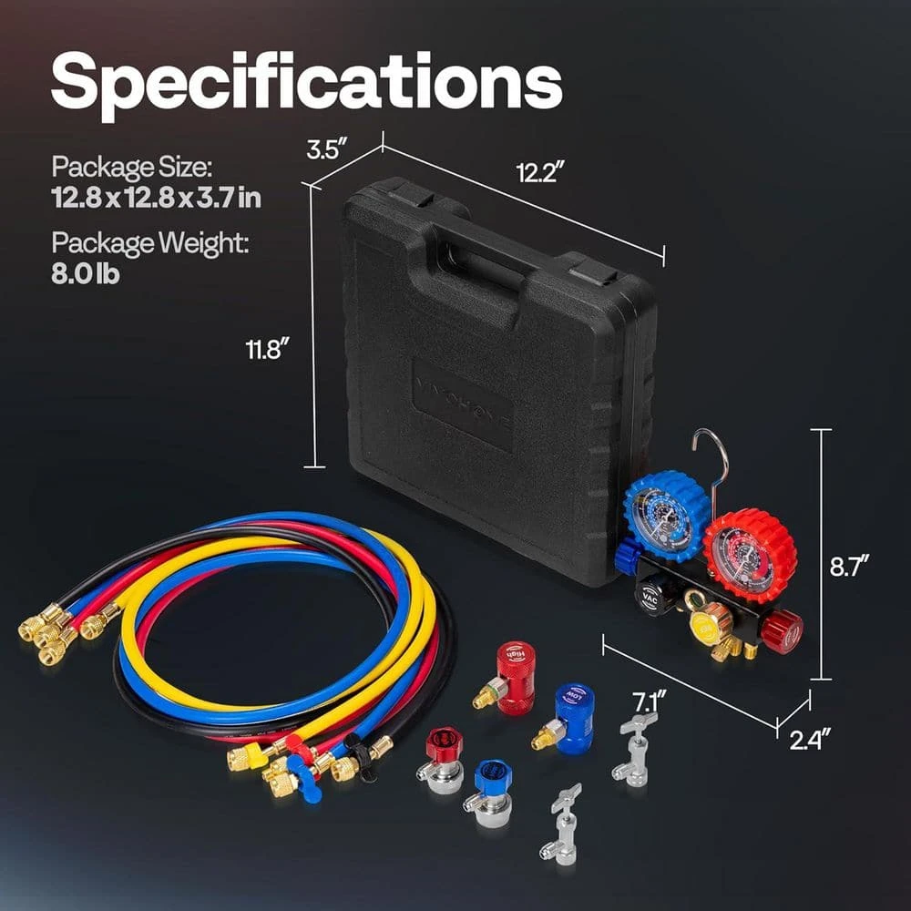 The VIVOHOME A/C Manifold Gauge Set combines precision, strength, and convenience in one package. This comprehensive kit includes all necessary adapters and fittings for both traditional and flammable refrigerants. Its professional-grade construction ensures it a long-lasting tool you can trust. Built with a robust aluminum body and premium brass fittings, this manifold gauge set is engineered for long-term use with excellent resistance to rust and corrosion.