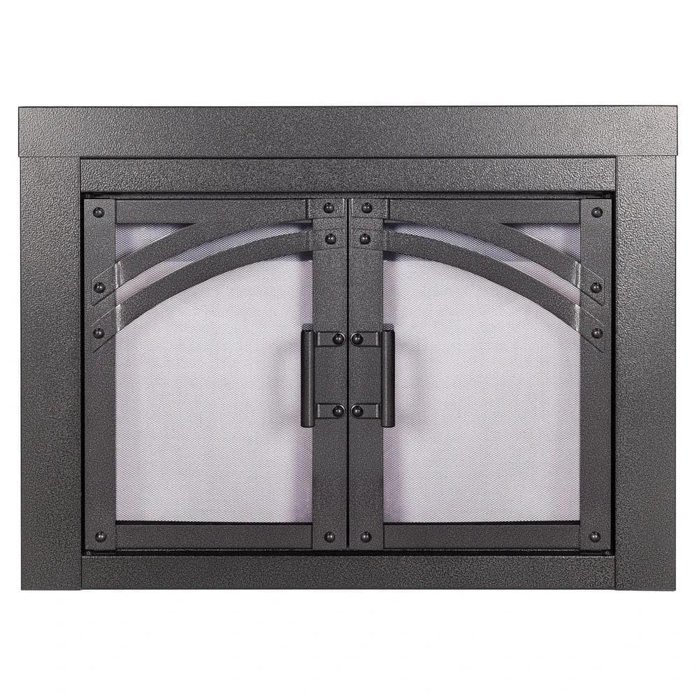 The Pleasant Hearth Axel Fireplace Glass Door Collection is a beautiful, hammered black, cabinet style, one-piece frame. When installed, the fireplace glass door enhances the appearance of your family’s indoor, wood-burning, traditional masonry fireplace hearth. All Pleasant Hearth Fireplace Glass Door sets are designed for masonry fireplaces only and are not compatible with prefabricated fireplaces – see our Sizing Guide for more details. The smoked 3/16-in tempered glass doors must stay open while the fire is burning, and the built-in mesh firescreen panels act as a barrier to help contain embers. Both the glass doors and mesh panels have easy-catch magnets to help keep them closed. The glass doors can help you save energy year-round – when closed, they prevent AC and heat loss through the chimney by up to 90%. The hidden damper knob at the bottom of the firescreen provides additional air flow to feed the fire for bigger, longer-lasting flames. Closed fireplace glass door sets also prevent cold chimney downdrafts from entering your home and keep pets and children out of fireplace soot. These fireplace glass doors are surface mounted flat against the fire place opening, allowing the doors to open fully to provide an incredible view of your fire from anywhere in the room. Pleasant Hearth has guided instructions on how to install your new fireplace glass doors in both the Product Manual and Installation Video.