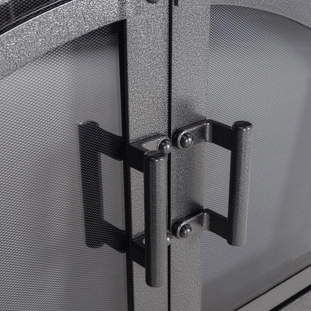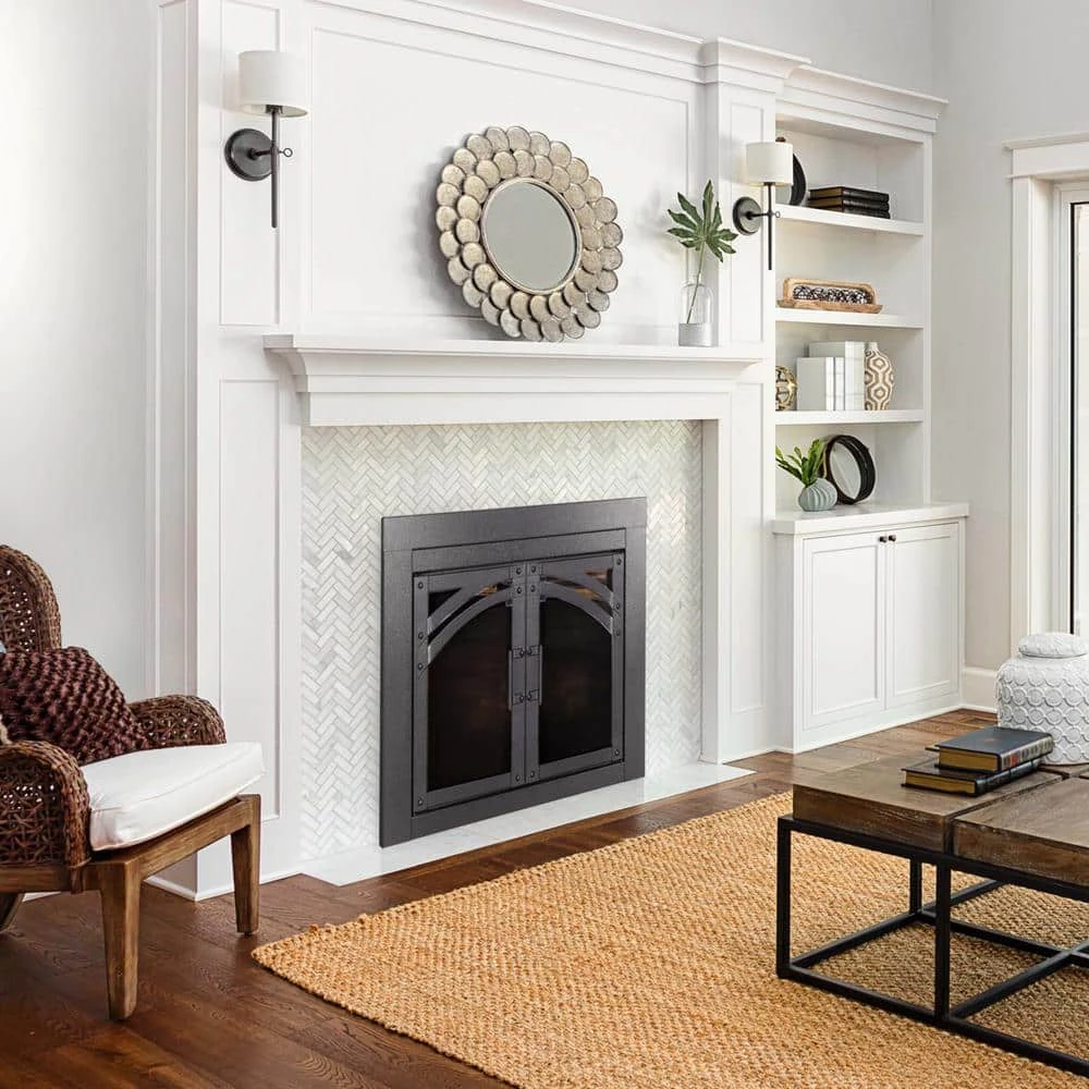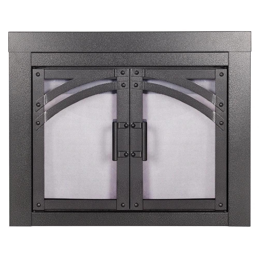 The Pleasant Hearth Axel Fireplace Glass Door Collection is a beautiful, hammered black, cabinet style, one-piece frame. When installed, the fireplace glass door enhances the appearance of your family’s indoor, wood-burning, traditional masonry fireplace hearth. All Pleasant Hearth Fireplace Glass Door sets are designed for masonry fireplaces only and are not compatible with prefabricated fireplaces – see our Sizing Guide for more details. The smoked 3/16-in tempered glass doors must stay open while the fire is burning, and the built-in mesh firescreen panels act as a barrier to help contain embers. Both the glass doors and mesh panels have easy-catch magnets to help keep them closed. The glass doors can help you save energy year-round – when closed, they prevent AC and heat loss through the chimney by up to 90%. The hidden damper knob at the bottom of the firescreen provides additional air flow to feed the fire for bigger, longer-lasting flames. Closed fireplace glass door sets also prevent cold chimney downdrafts from entering your home and keep pets and children out of fireplace soot. These fireplace glass doors are surface mounted flat against the fire place opening, allowing the doors to open fully to provide an incredible view of your fire from anywhere in the room. Pleasant Hearth has guided instructions on how to install your new fireplace glass doors in both the Product Manual and Installation Video.