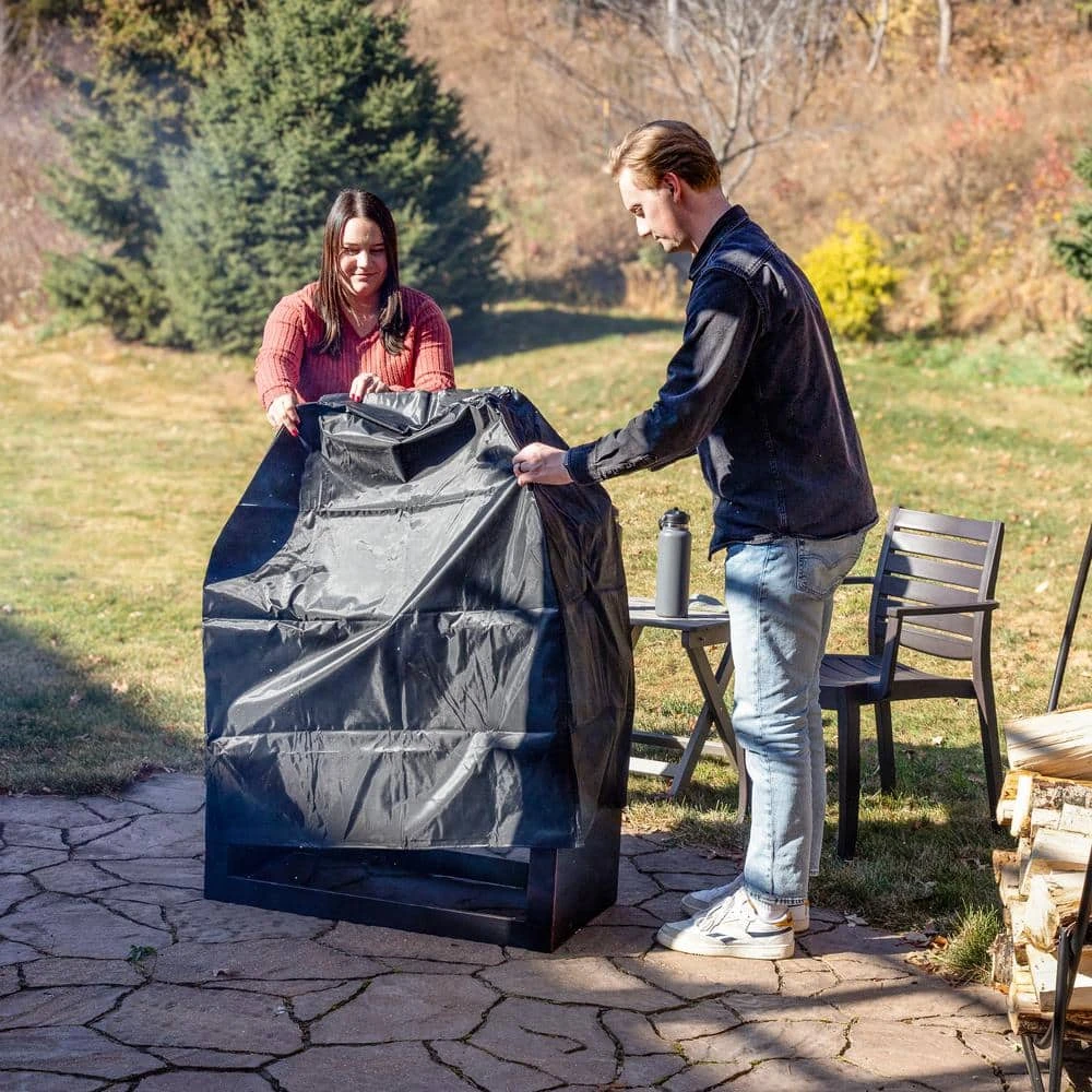 Transform a backyard or patio into a wonderful outdoor gathering place with this elegant outdoor wood-burning fireplace. With a sophisticated design and large size, this fireplace will serve as a fantastic centerpiece. The wide design ensures that there is plenty of space for everyone to gather around. It features a dependable steel construction that is sure to last season after season. Plus, it features built-in log storage so there is always enough firewood on hand to start the next bonfire. It features a pavilion-style roof and a geometric railing surrounding the fire area for a sophisticated look. Once the fire has completely extinguished and is cool to the touch, place the protective cover over the fireplace to help defend against the outdoor elements until it is time for another fire.