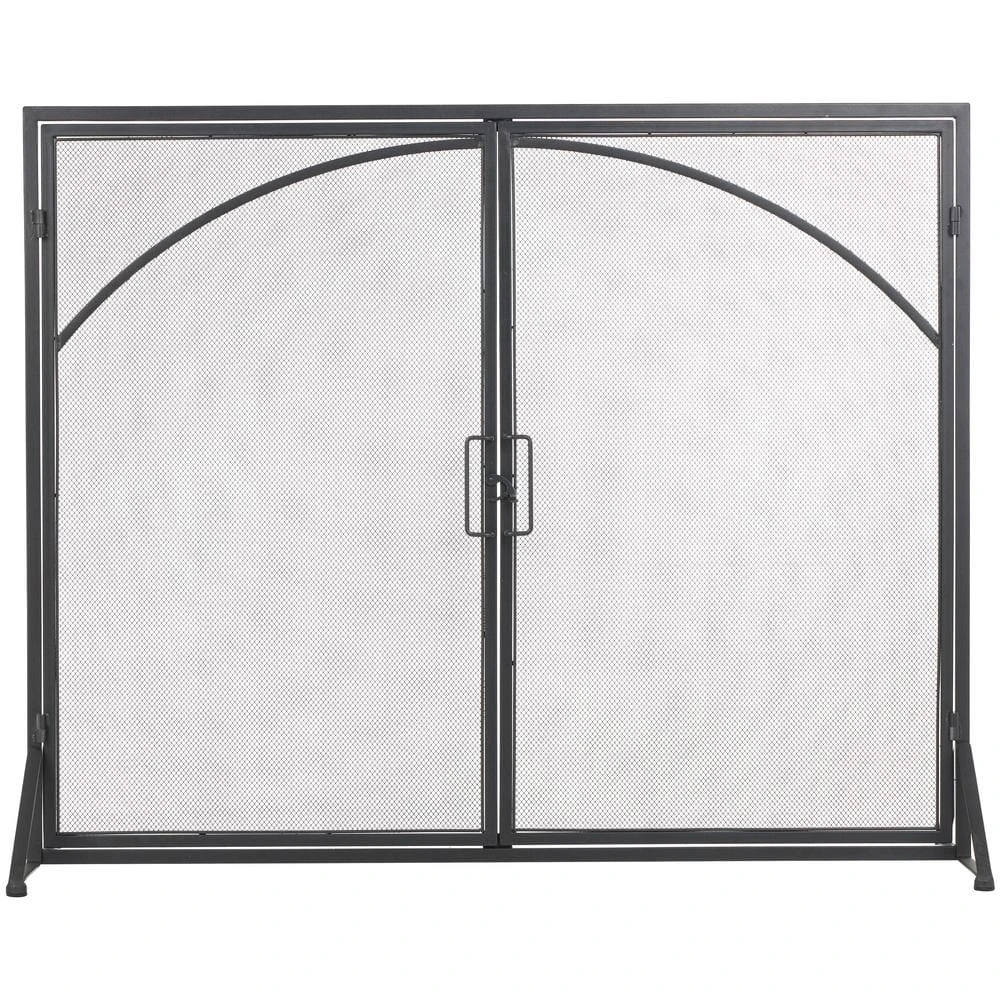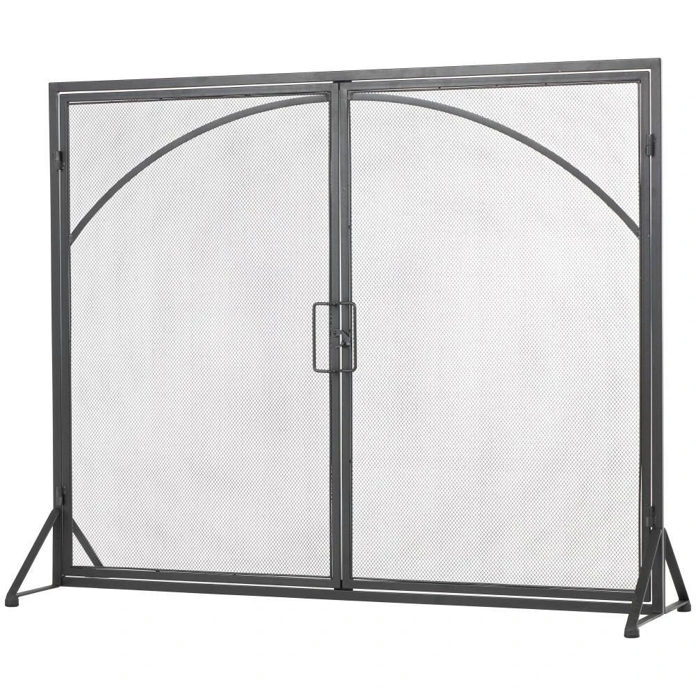 - Single panel fireplace screen features welded metal bars on top of a mesh background, with 2 hinged doors hooked together at the center, and welded metal feet on each side