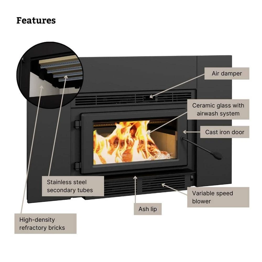 The large glass of the Blue Ridge 150-I surface highlights a panoramic view of the flames to fully enjoy your moments near the fire. This compact unit that has tapered top and sides for easy installation in smaller hearths. The deep bottom of its combustion chamber allows ash to accumulate and reduces the frequency of cleaning.