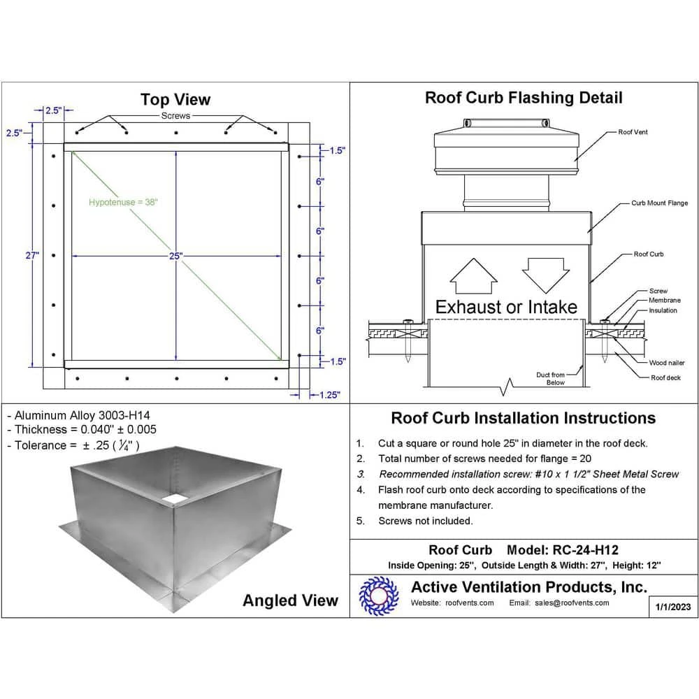 A roof curb is a box that acts as an extension from the roof deck. This extension provides a platform to mount a roof vent or exhaust fan. Proper installation ensures that the accessory has a level platform for attachment. Roof curbs can also work as a hatch, allowing easy access to duc2rk, HVAC units or maintenance in the attic below. Active Ventilation Products’ prefabricated roof curbs are for flat or low slope membrane roofs.