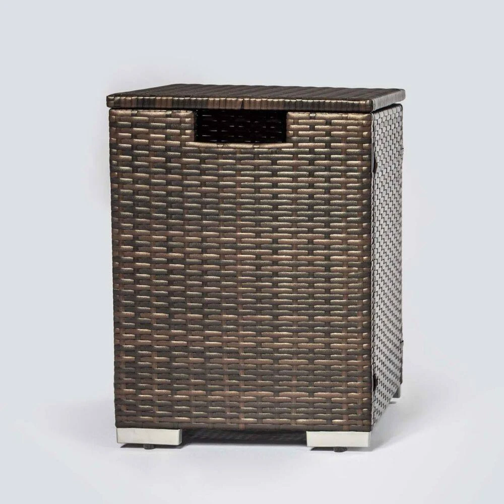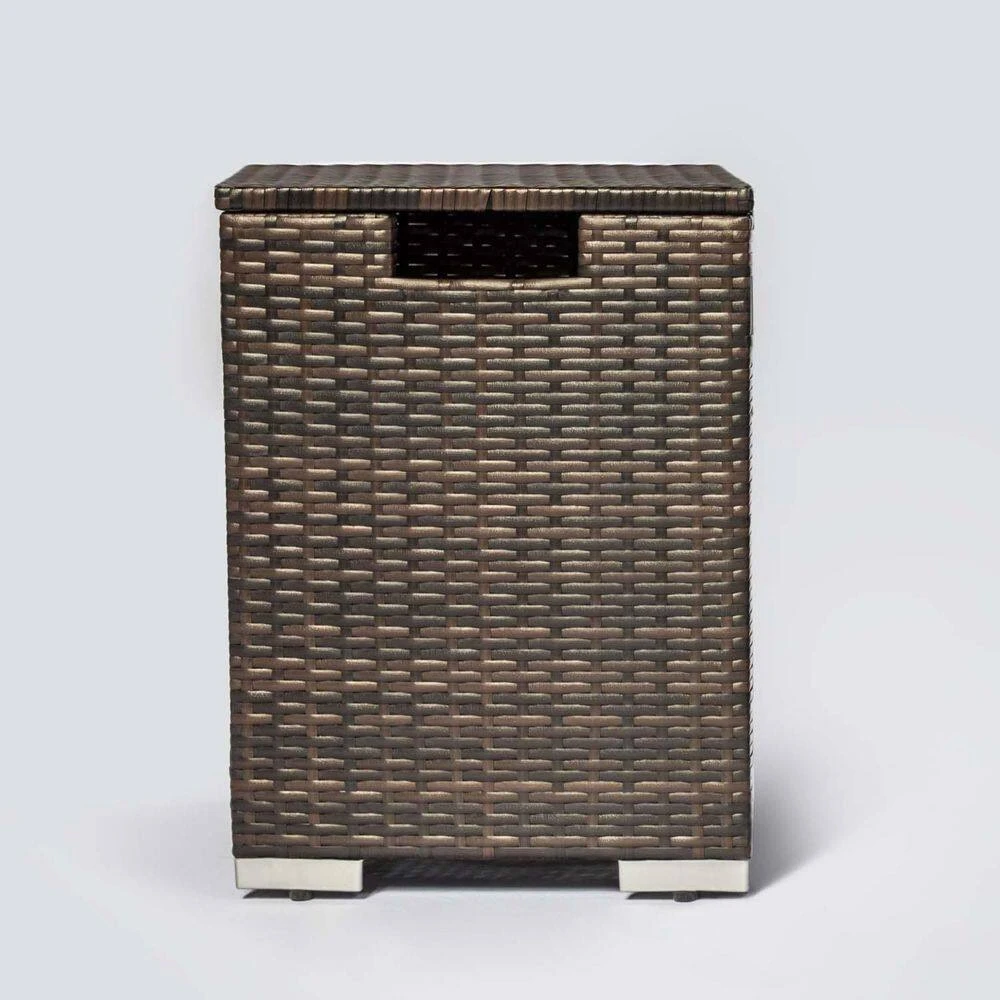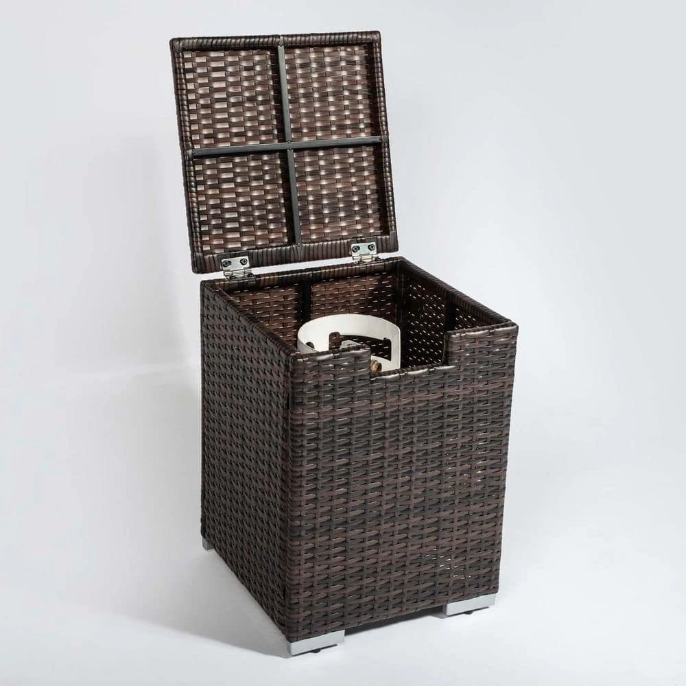 The propane tank cover with same espresso rattan finished to match your fire pit table or wicker sofa set, combine together as a harmonious atmosphere. This propane tank cover Sturdy and weather-resistant metal flame construction decorated by Fine-selected brown wicker integrates with most of the existing furnishing and provide you a long term enjoyment. This propane tank holder not only conceals your gas cylinder but also use as a portable side table, storage box or plant stand in your patio, garden, poolside, backyard or balcony.