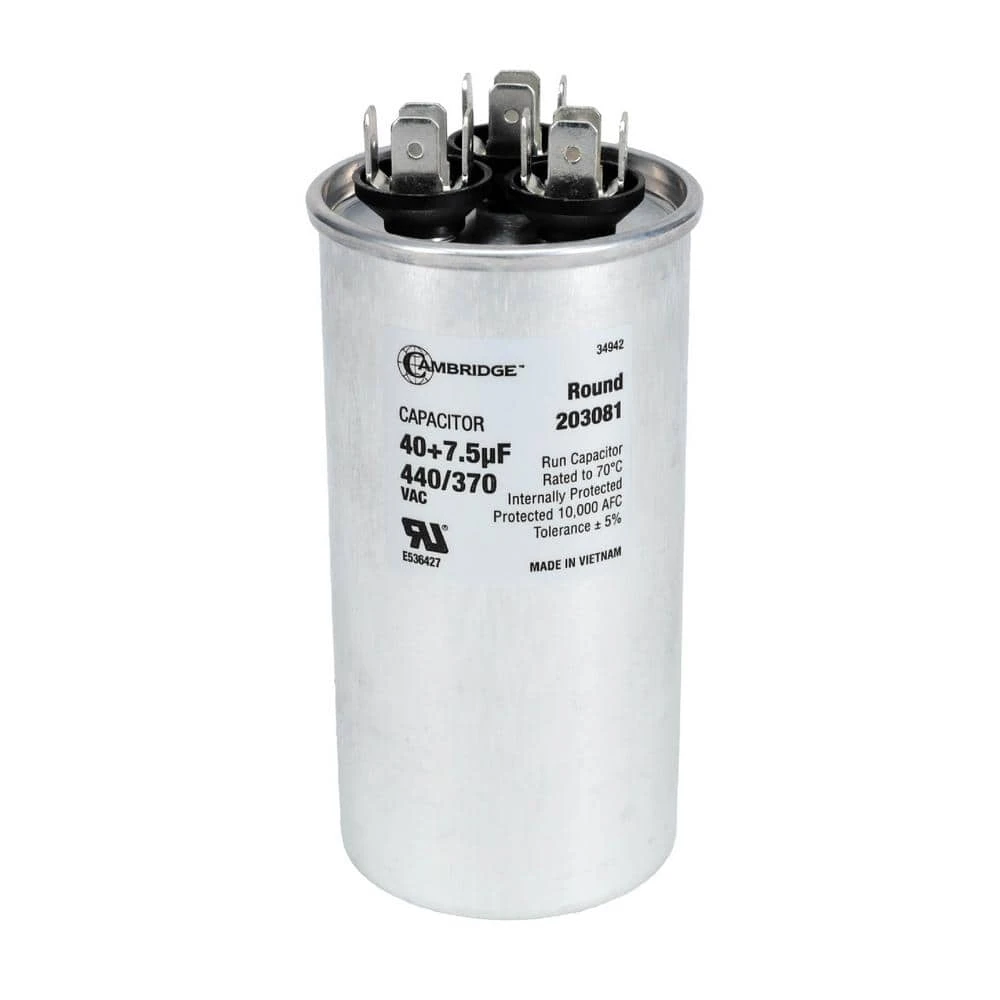 - Cambridge 40 plus 7.5μF plus or minus 5% 440/370 vac dual round run start AC capacitor