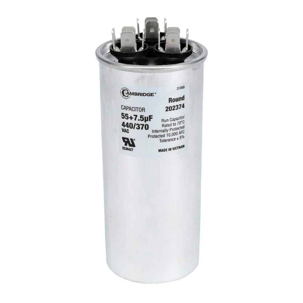 - Cambridge 55 plus 7.5μF plus or minus 5% 440/370 vac dual round run start AC capacitor