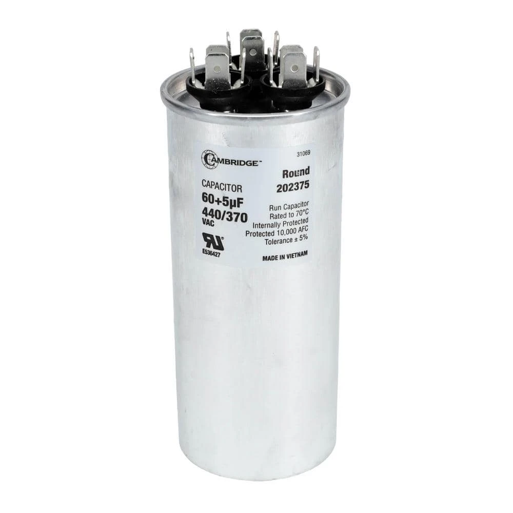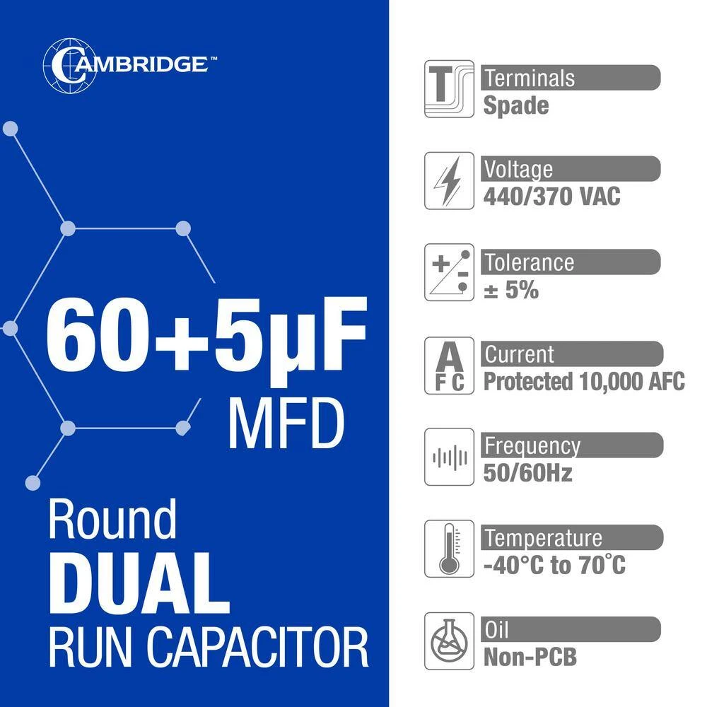 - Cambridge 60 plus 5μF plus or minus 5% 440/370 VAC dual round run start AC capacitor