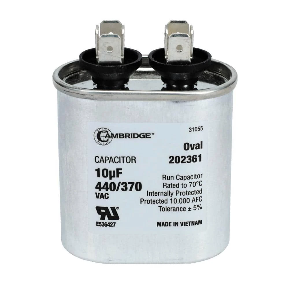 - Cambridge 10μF 5% 440/370 VAC single oval run start AC capacitor