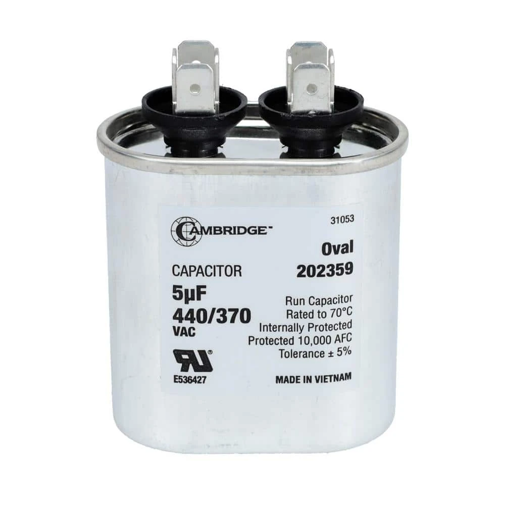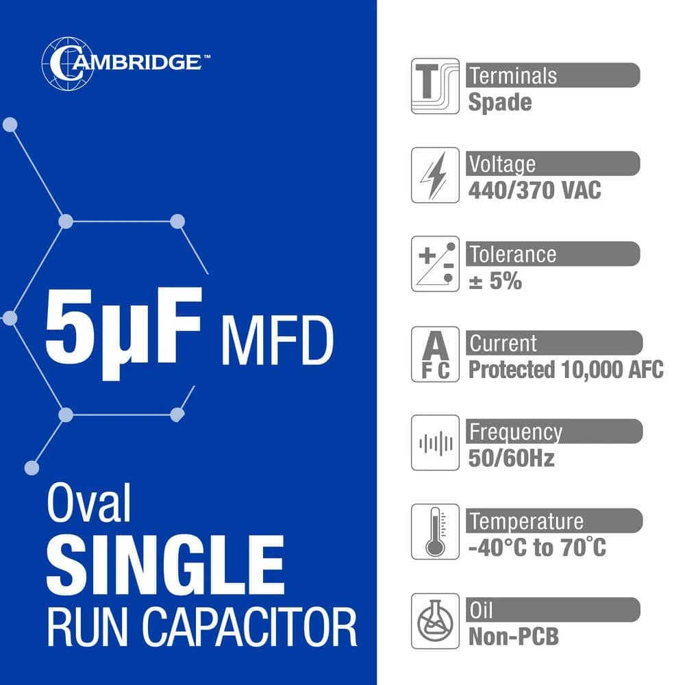 - Cambridge 5μF 5% 440/370 VAC single oval run start AC capacitor