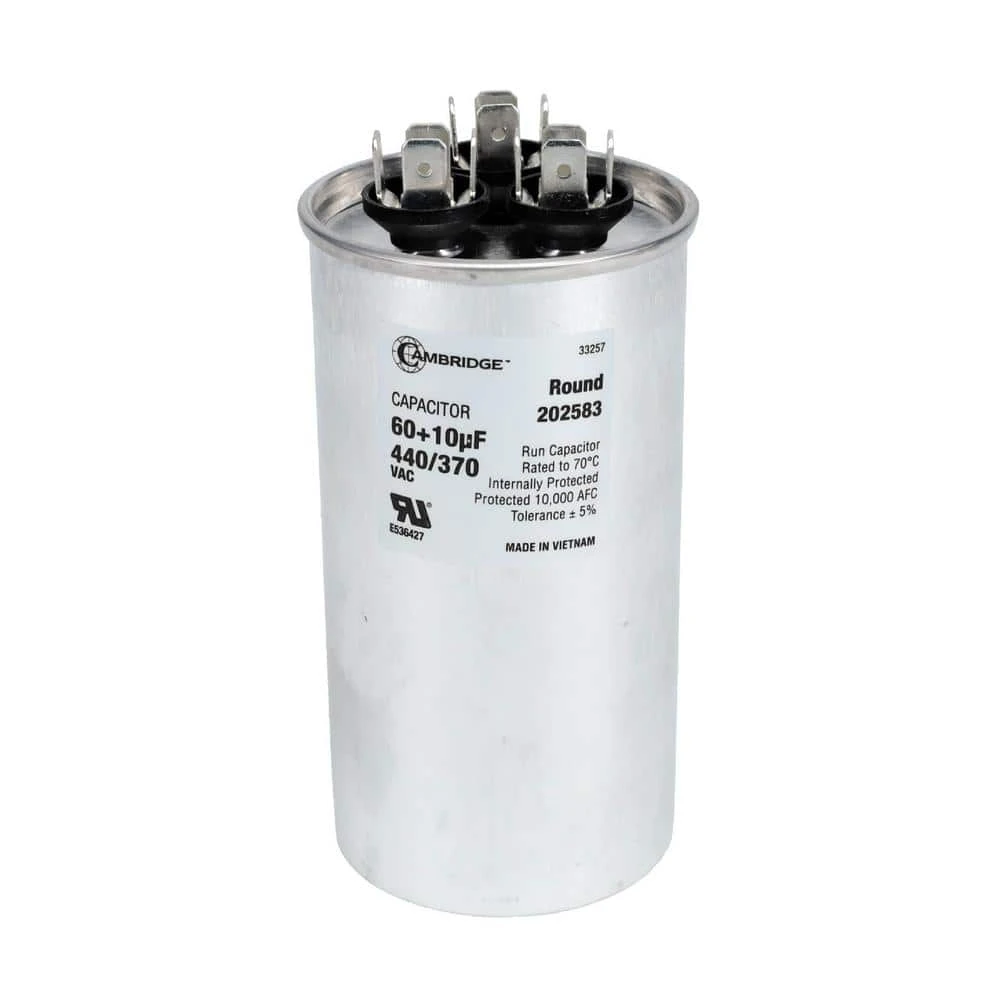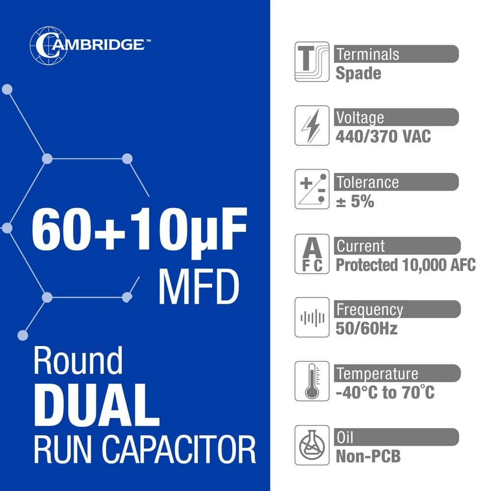 - Cambridge 60 plus 10μF plus or minus 5% 440/370 VAC dual round run start AC capacitor