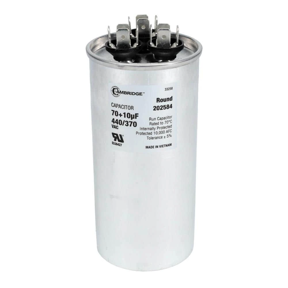 - Cambridge 70 plus 10μF plus or minus 5% 440/370-Volt AC dual round run start AC capacitor