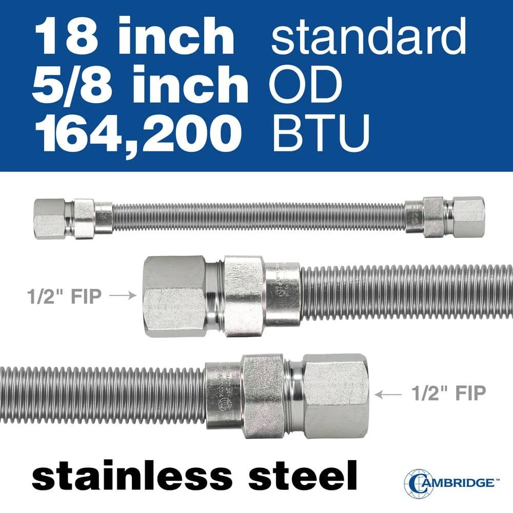 Model 112481 C-GC-581212 FF-18 Gas Connector – 18 in. Long, 5/8 in. OD (1/2 in. ID), 1/2 in. FIP and 1/2 in. FIP end connectionsEngineered for durability and safety, Cambridge 304 stainless steel gas connectors provide exceptional resistance to corrosion, high temperatures, and wear-ensuring a secure, long-lasting gas connection. The annealed stainless steel construction enhances flexibility and strength, reducing stress fractures over time for reliable performance in demanding environments. This gas connector also features flared-end fittings that create a secure, leak-resistant metal-to-metal seal. Ideal for both residential and commercial applications, it is perfect for gas ranges, water heaters, tankless water heaters, dryers, gas fireplaces, furnaces, and garage heaters. Additionally, it is suitable for stationary outdoor grills, gas fire pits, outdoor dryers, rooftop units,-offering a versatile solution for indoor and outdoor use. Certified for safety and compliance, this gas connector meets CSA certification and ANSI Z21.24, Z21.75/CSA 6.10, 6.27 standards, making it a trusted choice for professional contractors and homeowners alike.