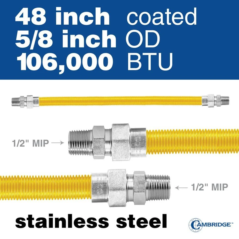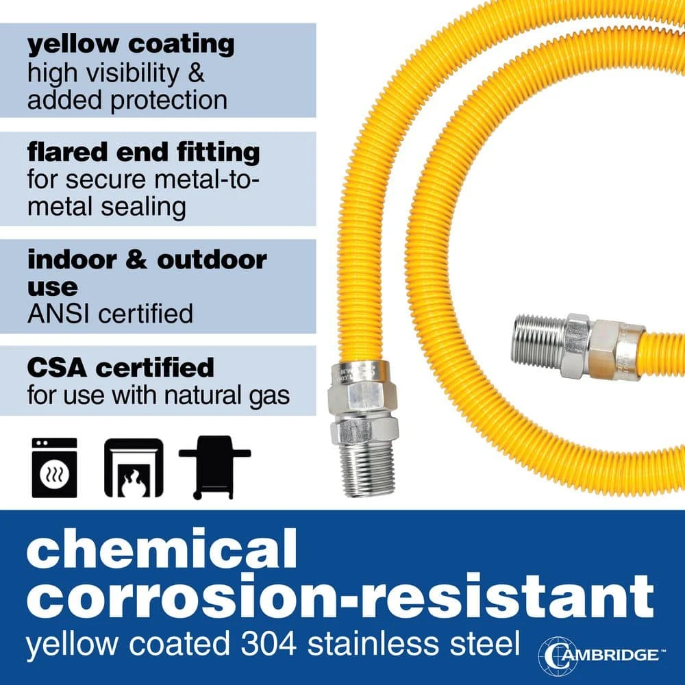Model 109024 C-GCY-581212 MM-48 Gas Connector – 48 in. Long, 5/8 in. OD (1/2 in. ID), 1/2 in. MIP and 1/2 in. MIP end connections, Yellow Coated Engineered for durability and safety, Cambridge yellow coated 304 stainless steel gas connectors provide exceptional resistance to corrosion, high temperatures, and wear-ensuring a secure, long-lasting gas connection. It features an industry-standard bright yellow coating, which provides clear gas line identification while also offering added protection against environmental and chemical exposure. The annealed stainless steel construction enhances flexibility and strength, reducing stress fractures over time for reliable performance in demanding environments. This gas connector also features flared-end fittings that create a secure, leak-resistant metal-to-metal seal. Ideal for both residential and commercial applications, it is perfect for gas ranges, water heaters, tankless water heaters, dryers, gas fireplaces, furnaces, and garage heaters. Additionally, it is suitable for stationary outdoor grills, gas fire pits, outdoor dryers, rooftop units,-offering a versatile solution for indoor and outdoor use. Certified for safety and compliance, this gas connector meets CSA certification and ANSI Z21.24, Z21.75/CSA 6.10, 6.27 standards, making it a trusted choice for professional contractors and homeowners alike.