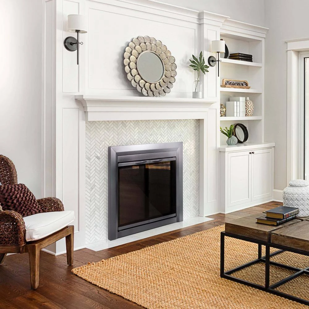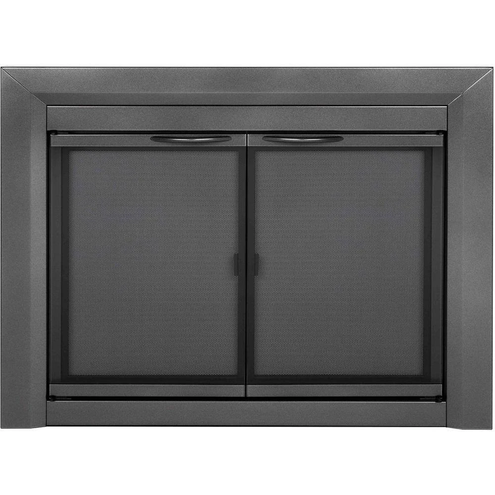 The Pleasant Hearth Carlisle Fireplace Glass Door Collection is a beautiful, gunmetal, cabinet style, one-piece frame. When installed, the fireplace glass door enhances the appearance of your family’s indoor, wood-burning, traditional masonry fireplace hearth. All Pleasant Hearth Fireplace Glass Door sets are designed for masonry fireplaces only and are not compatible with prefabricated fireplaces – see our Sizing Guide for more details. The smoked 3/16-in tempered glass doors must stay open while the fire is burning, and the built-in mesh firescreen panels act as a barrier to help contain embers. Both the glass doors and mesh panels have easy-catch magnets to help keep them closed. The glass doors can help you save energy year-round – when closed, they prevent AC and heat loss through the chimney by up to 90%. The hidden damper knob at the bottom of the firescreen provides additional air flow to feed the fire for bigger, longer-lasting flames. Closed fireplace glass door sets also prevent cold chimney downdrafts from entering your home and keep pets and children out of fireplace soot. These fireplace glass doors are surface mounted flat against the fire place opening, allowing the doors to open fully to provide an incredible view of your fire from anywhere in the room. Pleasant Hearth has guided instructions on how to install your new fireplace glass doors in both the Product Manual and Installation Video.
