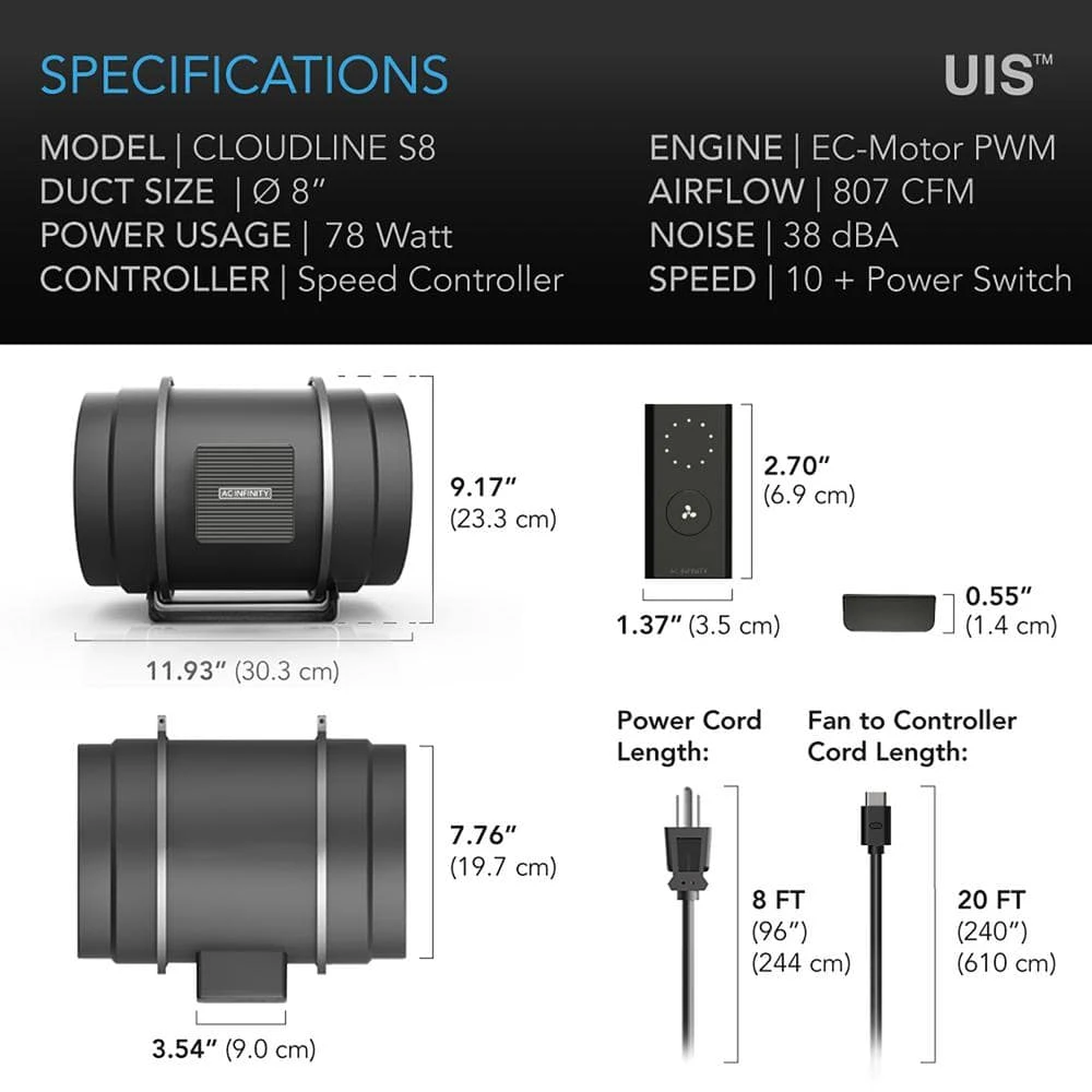 - Duct size: 8 in., dimensions: 8.5 in. x 11.9 in. x 9.2 in., airflow: 807 CFM, noise: 39 dBA, bearings: dual ball