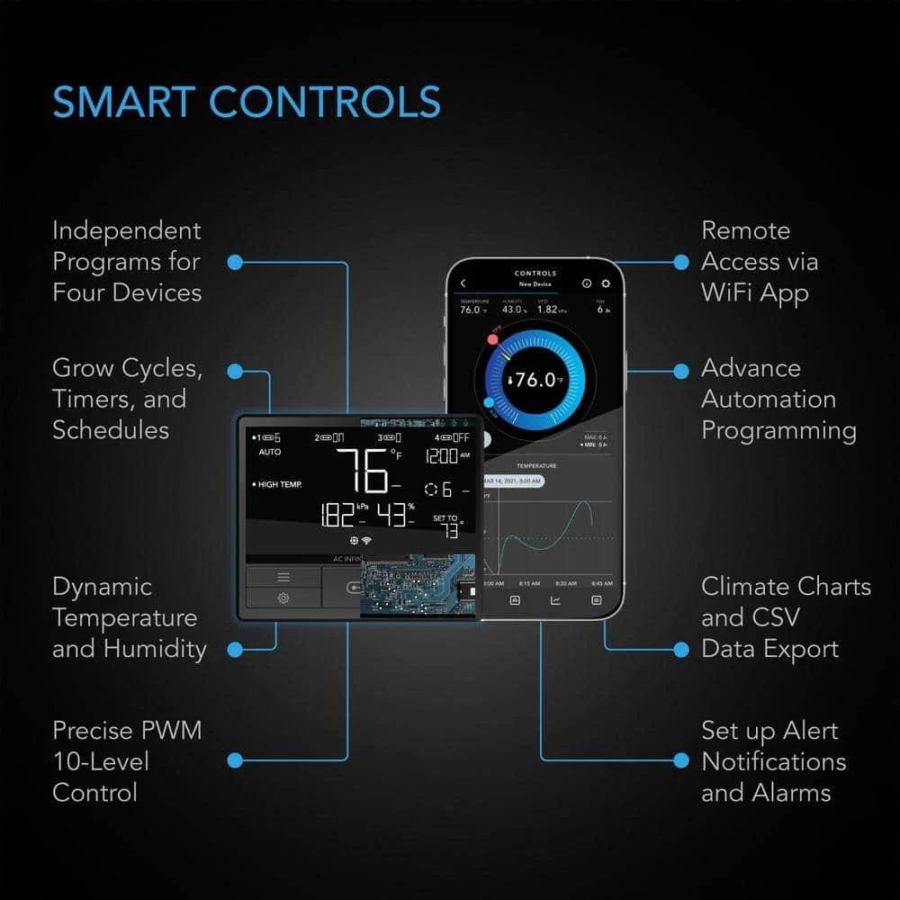 - Intelligent controller with temperature and humidity programming, fan speed control, timer, and alarm system