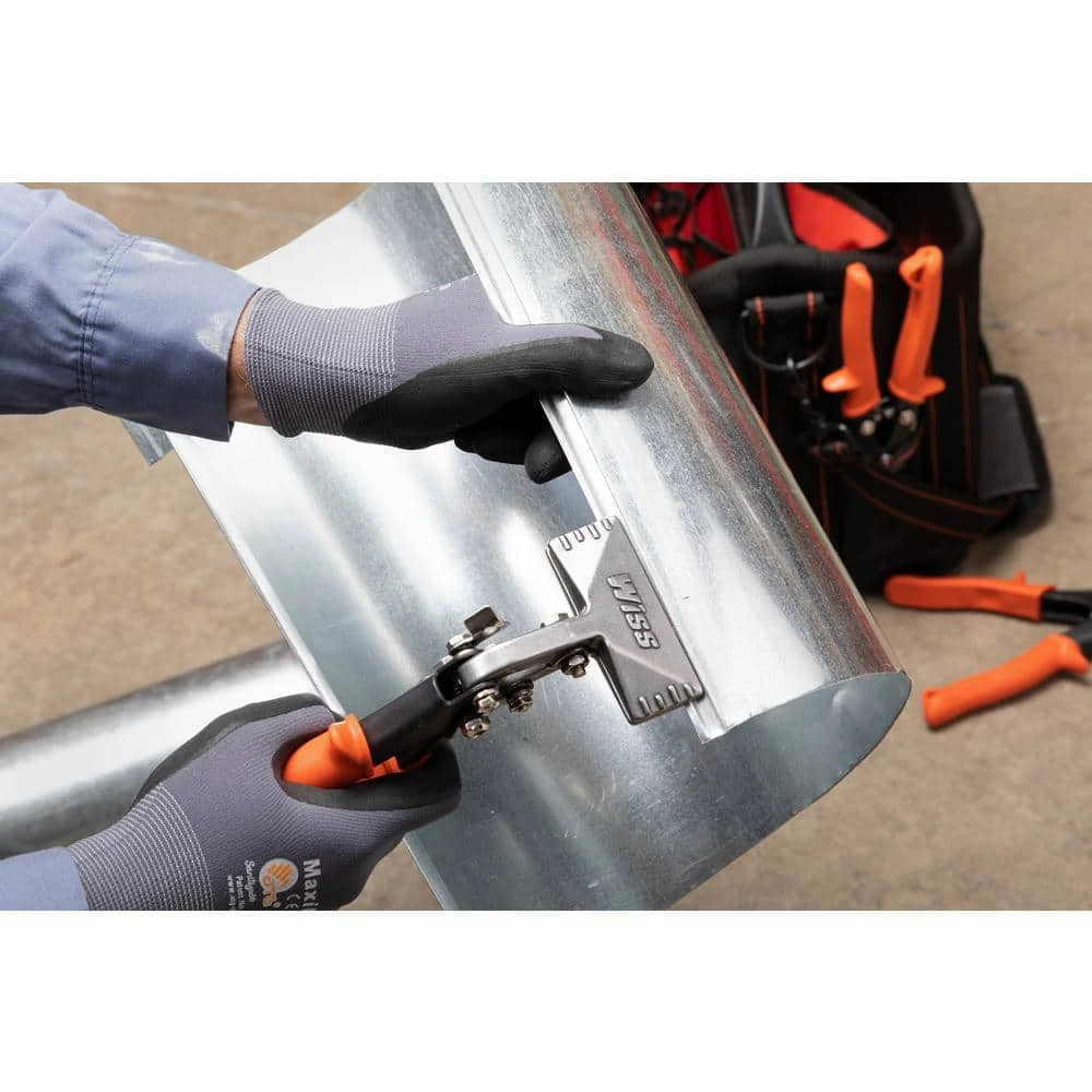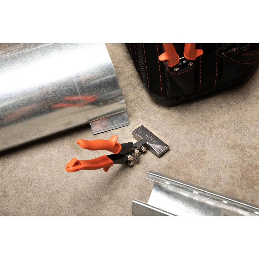 The Crescent Wiss Offset Hand Seamer is a powerful tool for bending or flattening sheet metal by hand. It utilizes an optimal handle span to deliver maximum power from an ergonomic operating range and features non-slip cushion grips for superior comfort and control. This hand seamer produces a permanent, tight-fitting seam.