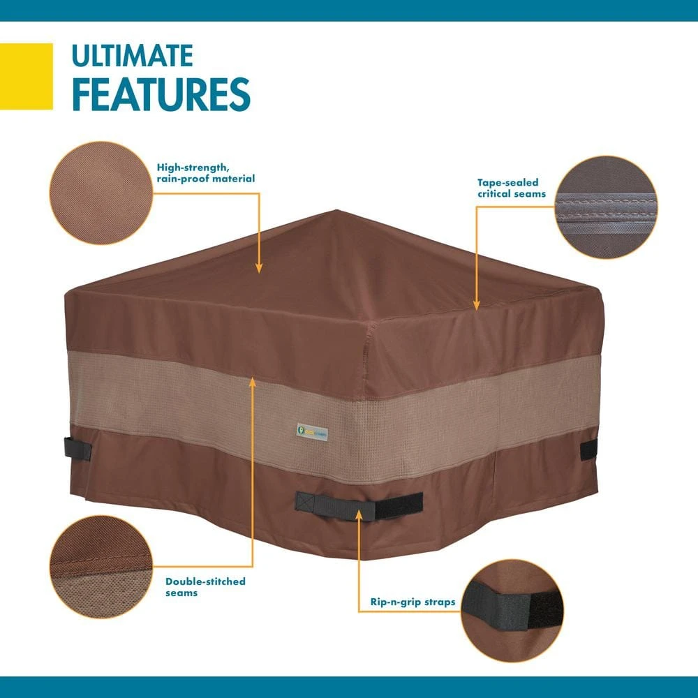 Ideal for use in harsh weather and high wind conditions, Ultimate covers are designed to protect fire pits from dust, dirt, sun, rain and heavy snow. Manufactured using a combination of high-strength polyester top panel, plus innovative, multi-layer, breathable side panels to help eliminate condensation. The multi-layer, breathable side panels eliminates the need for vents and provides additional cover height, unlike shorter competitive covers which offer less protection. High-strength polyester base for added durability. Mocha Cappuccino color. Two-year limited warranty has you covered. Migrate to Duck Covers today!