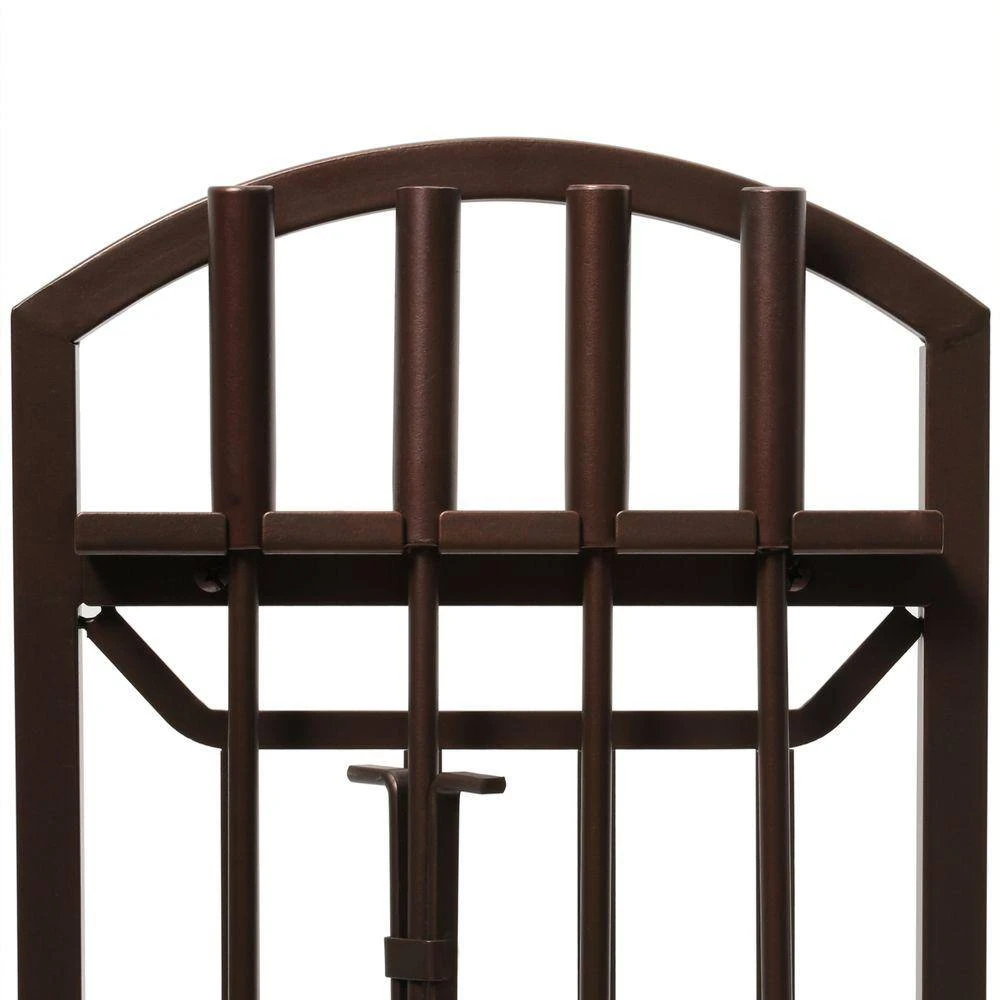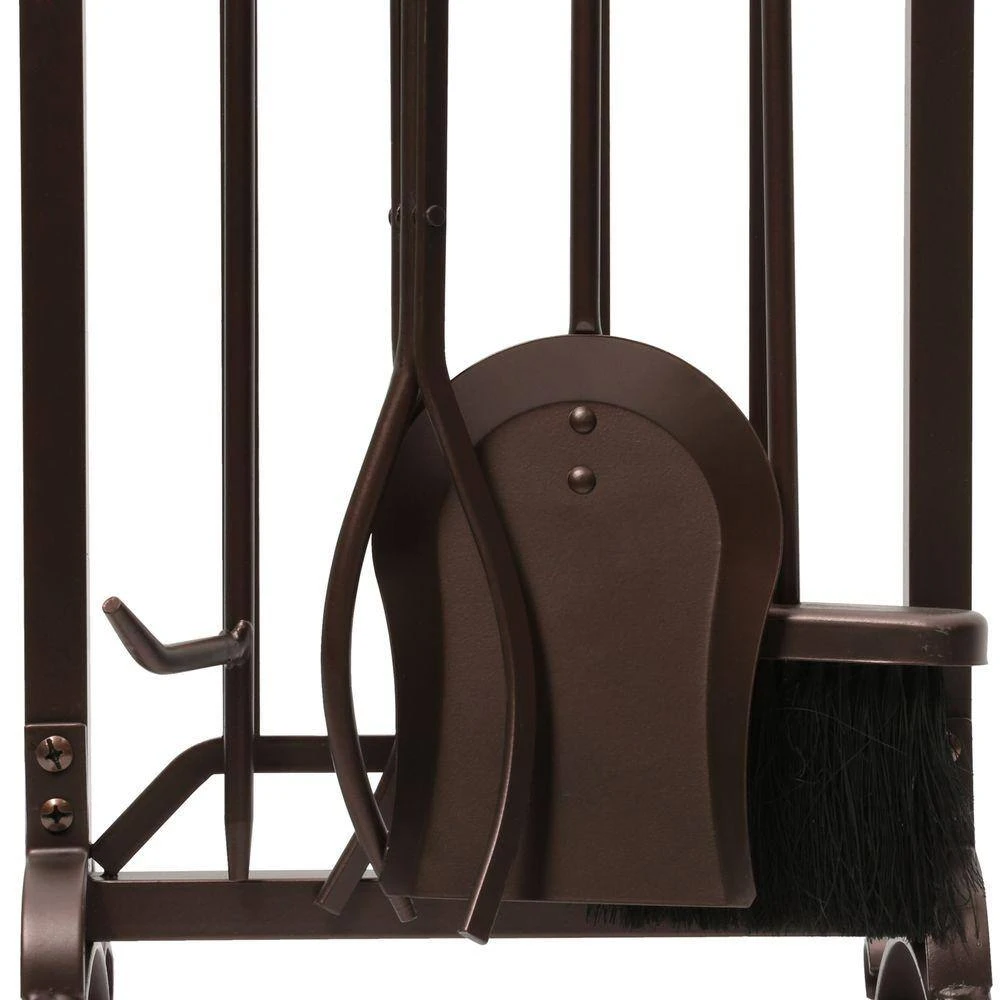 The Emberly Brown 5-Piece Fireplace Tool Set from Home Decorators Collection is constructed from steel with a tubular frame and solid handle. A heavy-duty base ensures stability, while the powder-coated finish offers additional durability. This set includes all the tools necessary to safely tend a fire.