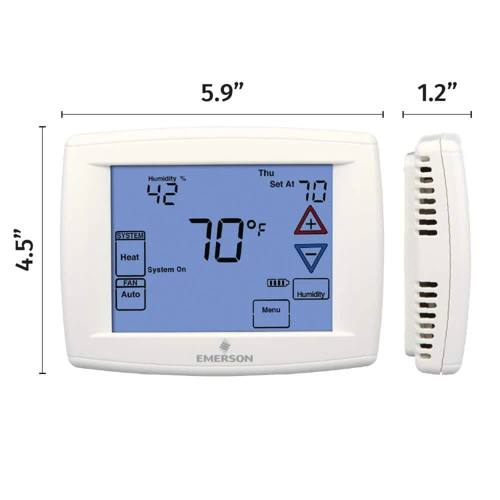Keep your home at the perfect temperature 7 days a week with the Emerson Blue Thermostat with Humidity Control. This programmable touchscreen thermostat allows you set a different schedule for each day of the week. A 12 in. display guides you through set-up, programming and operation, showing only the touch keys you need to see. Keep humidity at the level you want with the advanced humidity control feature. This thermostat works with most furnaces, air conditioners, and heat pump systems, including dual fuel systems. Not compatible with electric baseboard heat and some other systems.