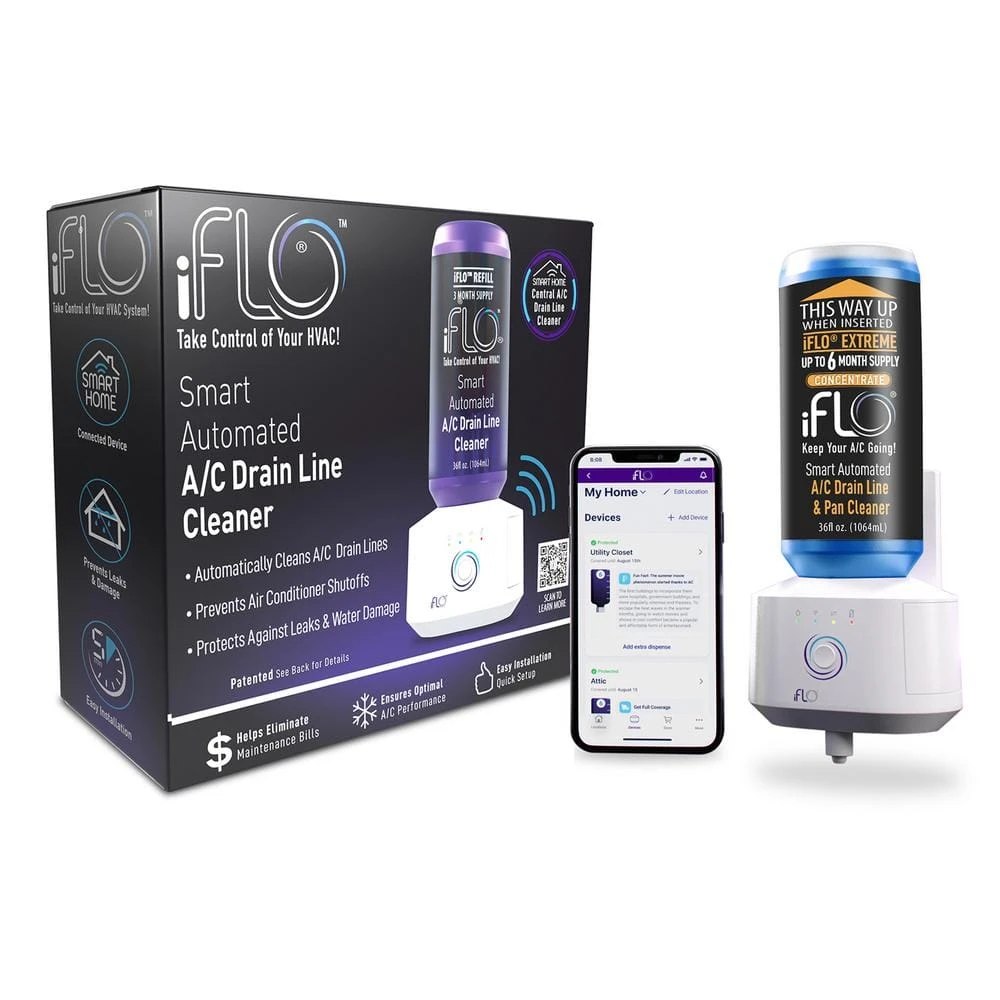 Keep your A/C going and the cool air flowing with iFLO-The world’s first, automatic A/C drain line and drain pan cleaning system. Using patented technology, iFLO automatically dispenses a proven bio-enzymatic cleaning fluid that actively breaks down clogs and flushes them completely out, keeping drain lines clean and clear year-round. iFLO is the only smart connected device of its kind on the market today.