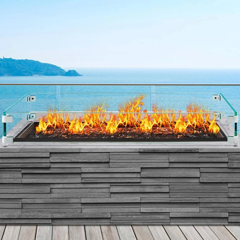 The VEVOR fire pit wind guard.Fire pit flame guard effectively reduces wind compact on fire table and excellent fit in your patio or garden. It shelters the flame while providing a barrier for users along with polished edges. Easy set and use with necessary accessories. Long-lasting durability assured with tempered glass and aluminum alloy corner brackets.