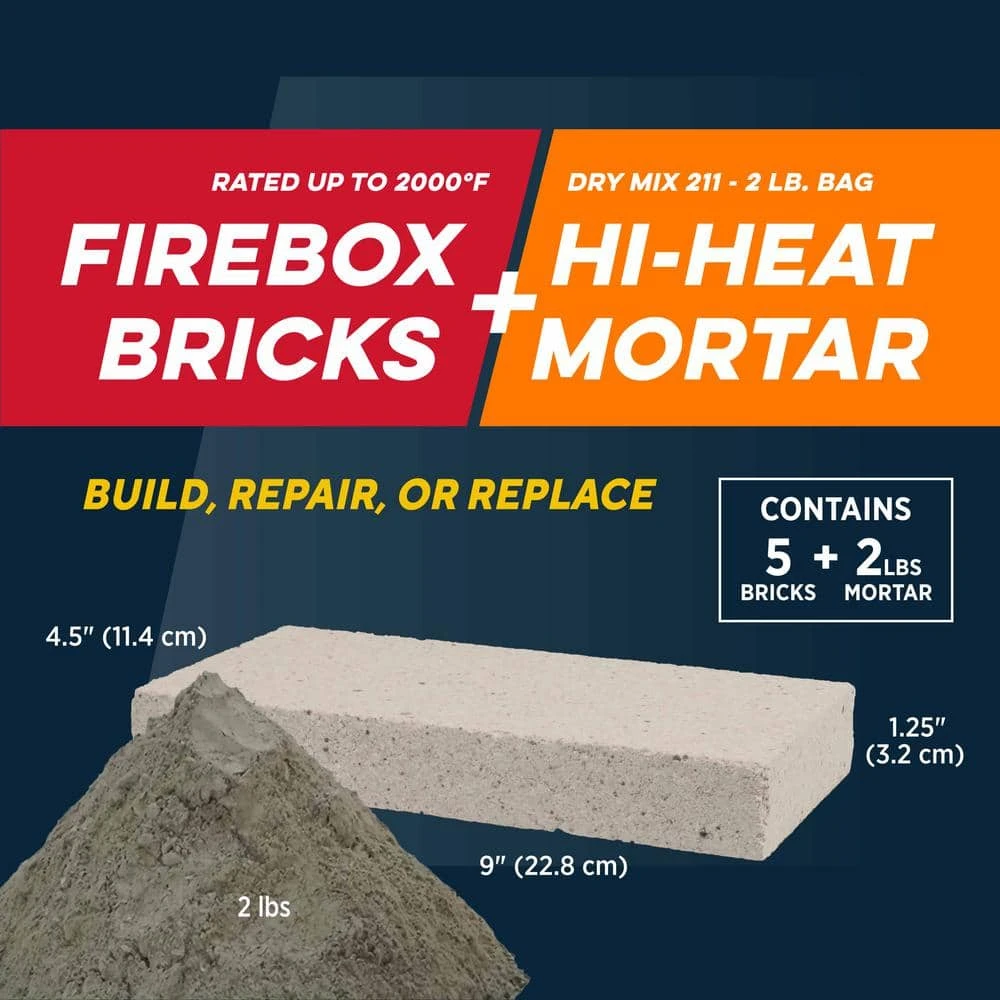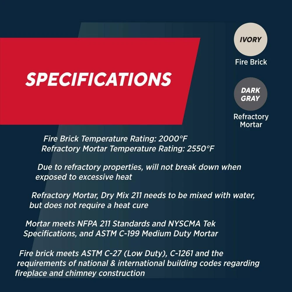 Rutland Firebrick & Mortar Kit bundles our trusted high-heat mortar and our new ivory firebricks in a single package. Dry Mix 211 is a user-friendly and versatile refractory mortar that doesn’t require a heat cure. Our ivory Firebox Bricks are an economical solution for wood-burning appliances, designed to reflect maximum heat back into the firebox and living area. Build, repair or replace fireboxes, fireplaces, fire pits, stove linings and even pizza ovens with Firebrick & Mortar Kit.