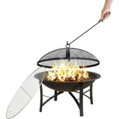 Black Fire Pit Steel Bowl With Spark Screen Cover, Log Grate & Poker For Outdoor