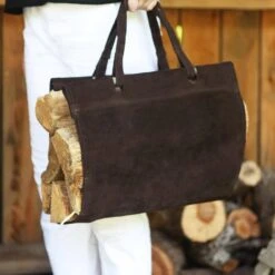 16 In. W Dark Brown Suede Log Carrier With Handles For Firewood Rack