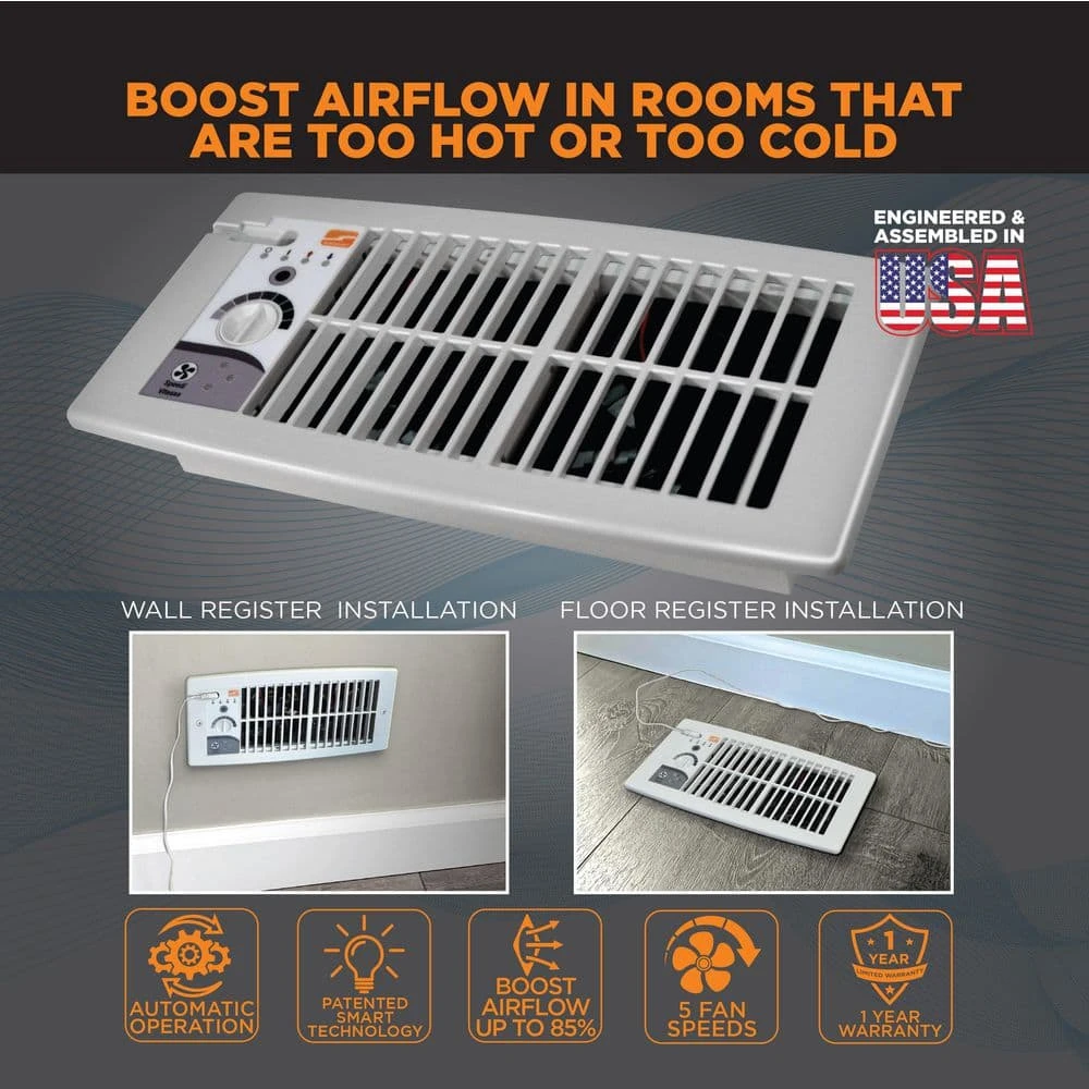 The Suncourt Flush Fit Smart Register Booster quietly boosts heated or cooled air to a room to improve circulation and comfort. This register booster features a built-in temperature sensor and works automatically with forced air systems. The Flush Fit Smart Register Booster’s quiet 5-speed; dual fans pull extra air out of weak registers, boosting airflow by up to 85%. It is a simple, energy efficient and safe solution for rooms that are too hot or too cold.