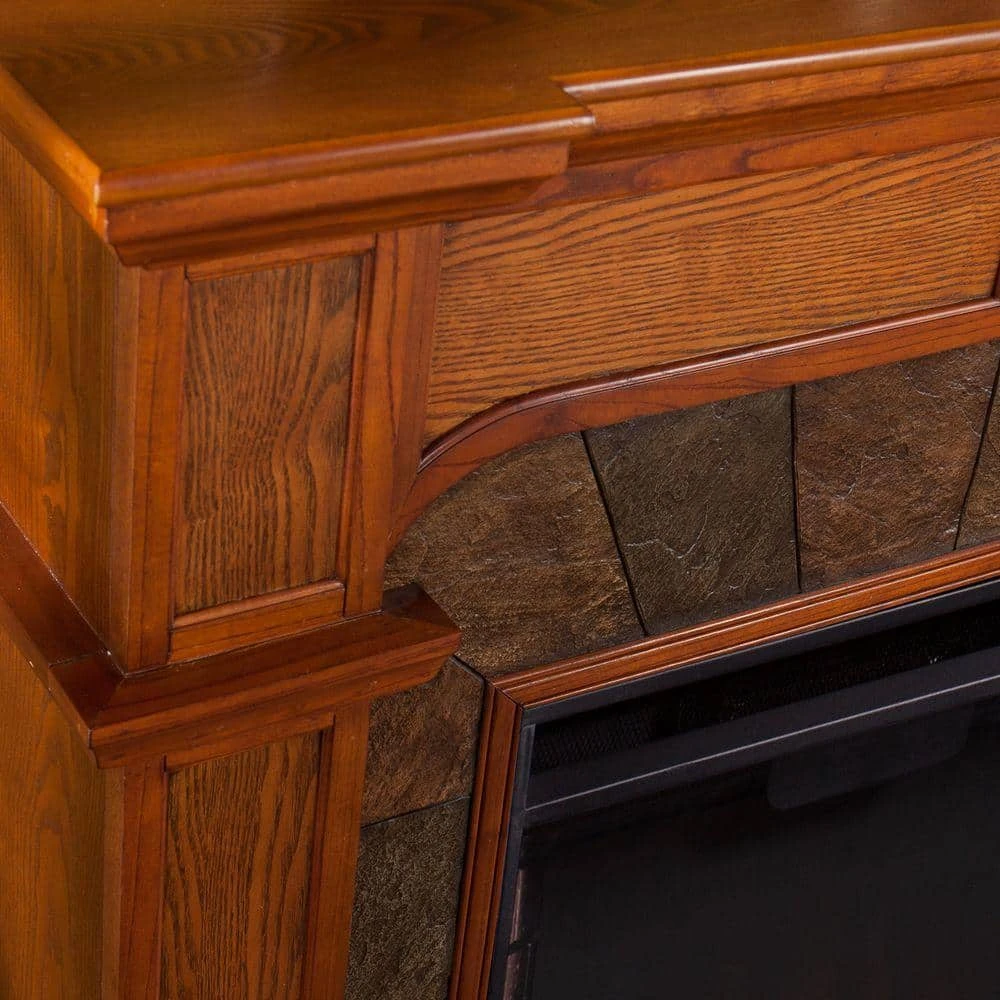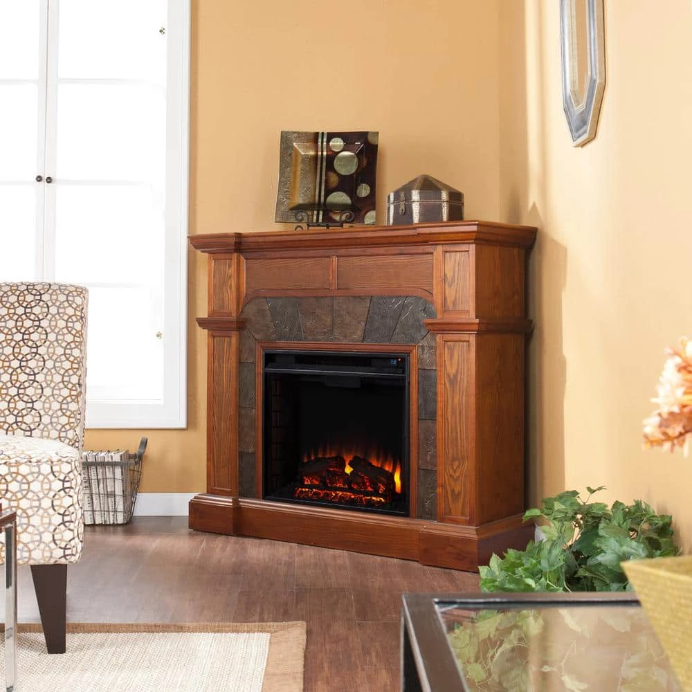 - Corner-convertible electric fireplace with faux slate surround