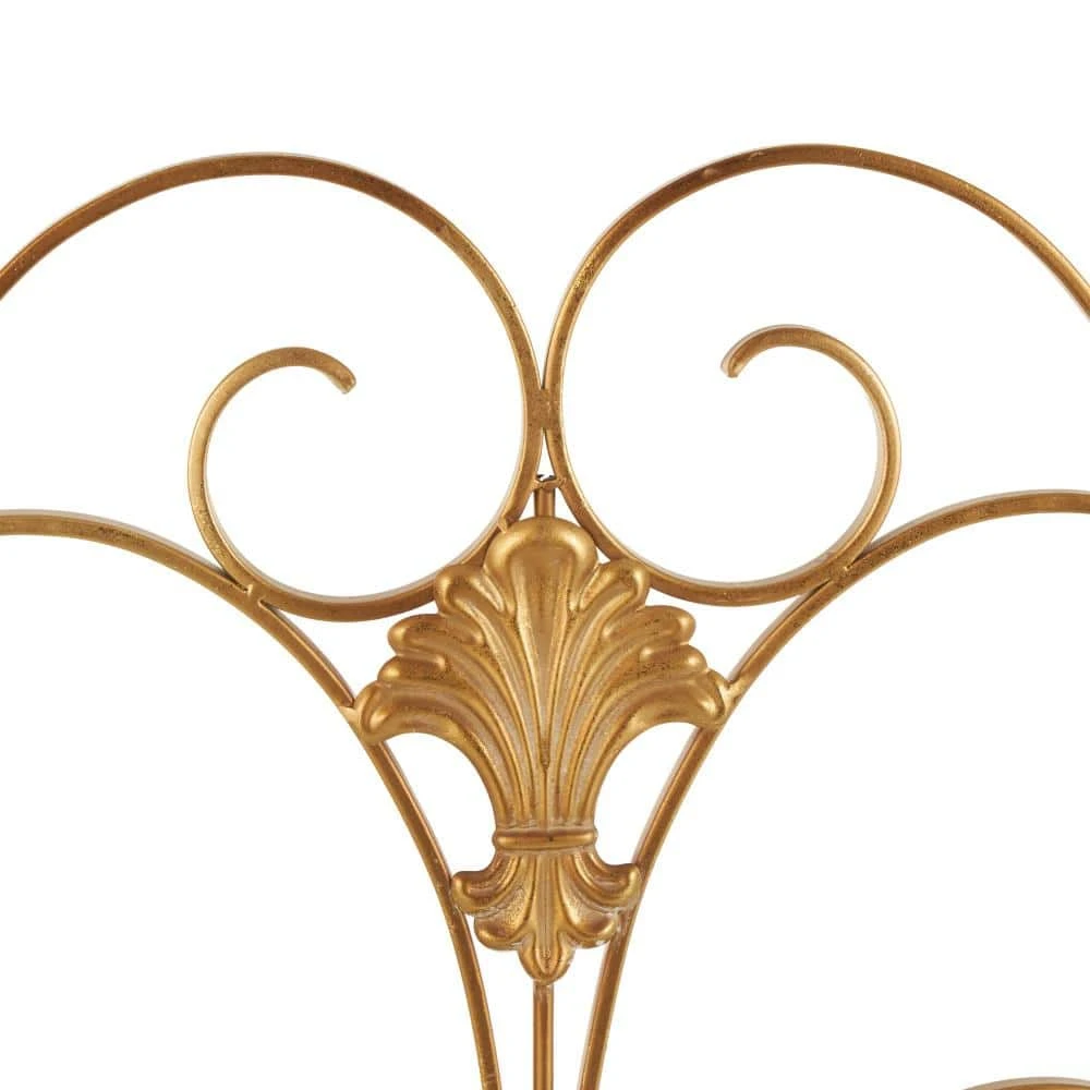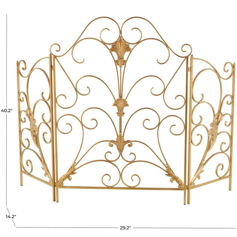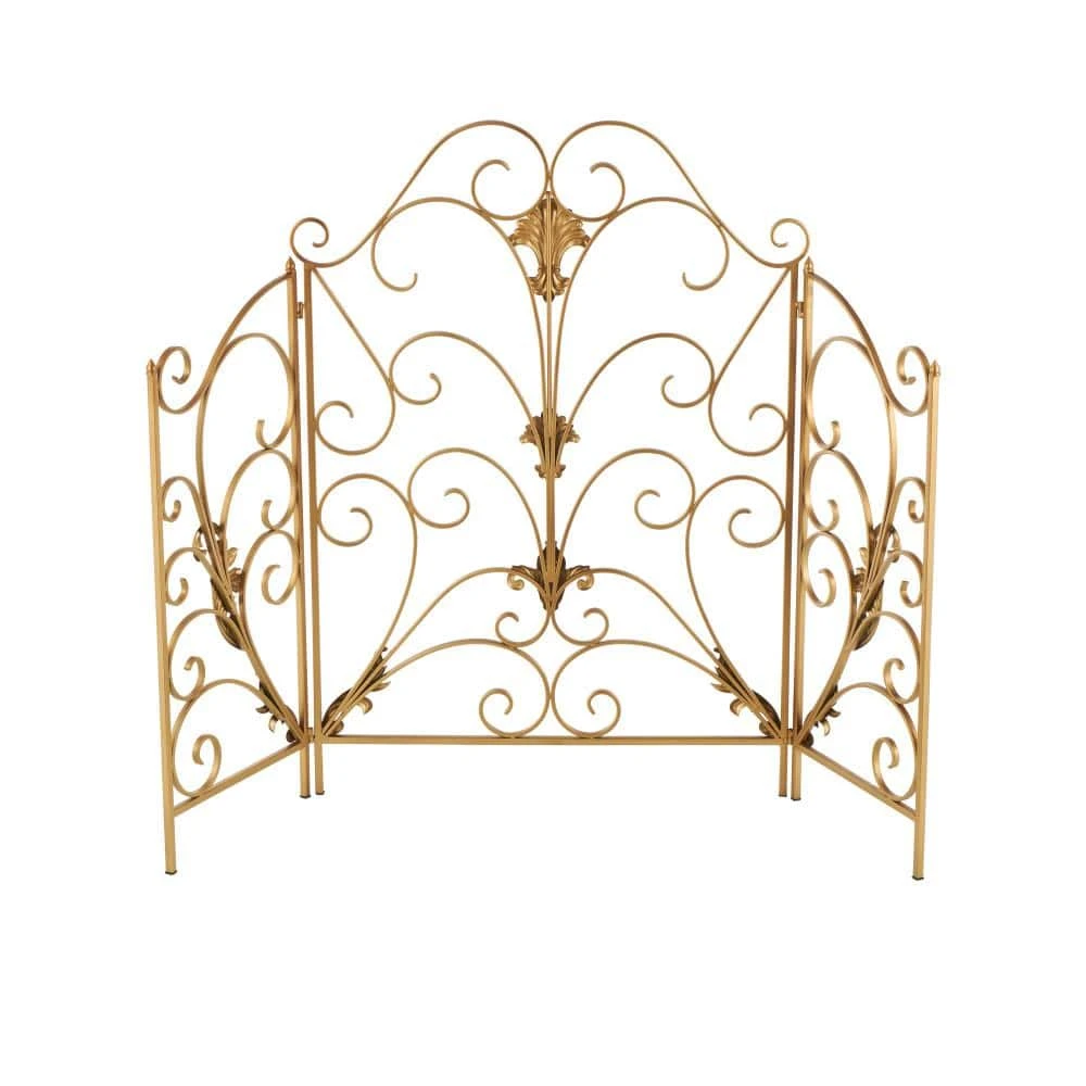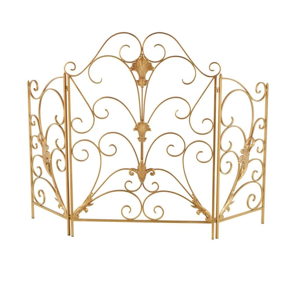 Place this scroll fire spark guard in your living space to shield your room from sparks while adding a decorative touch to your fireplace area. This item ships in 1 carton. Please note that this item is for decorative use only. Suitable for indoor use only. This item ships fully assembled in 1-piece. Item features 3 panel screens. This is a single gold colored fire spark guard. Traditional style.
