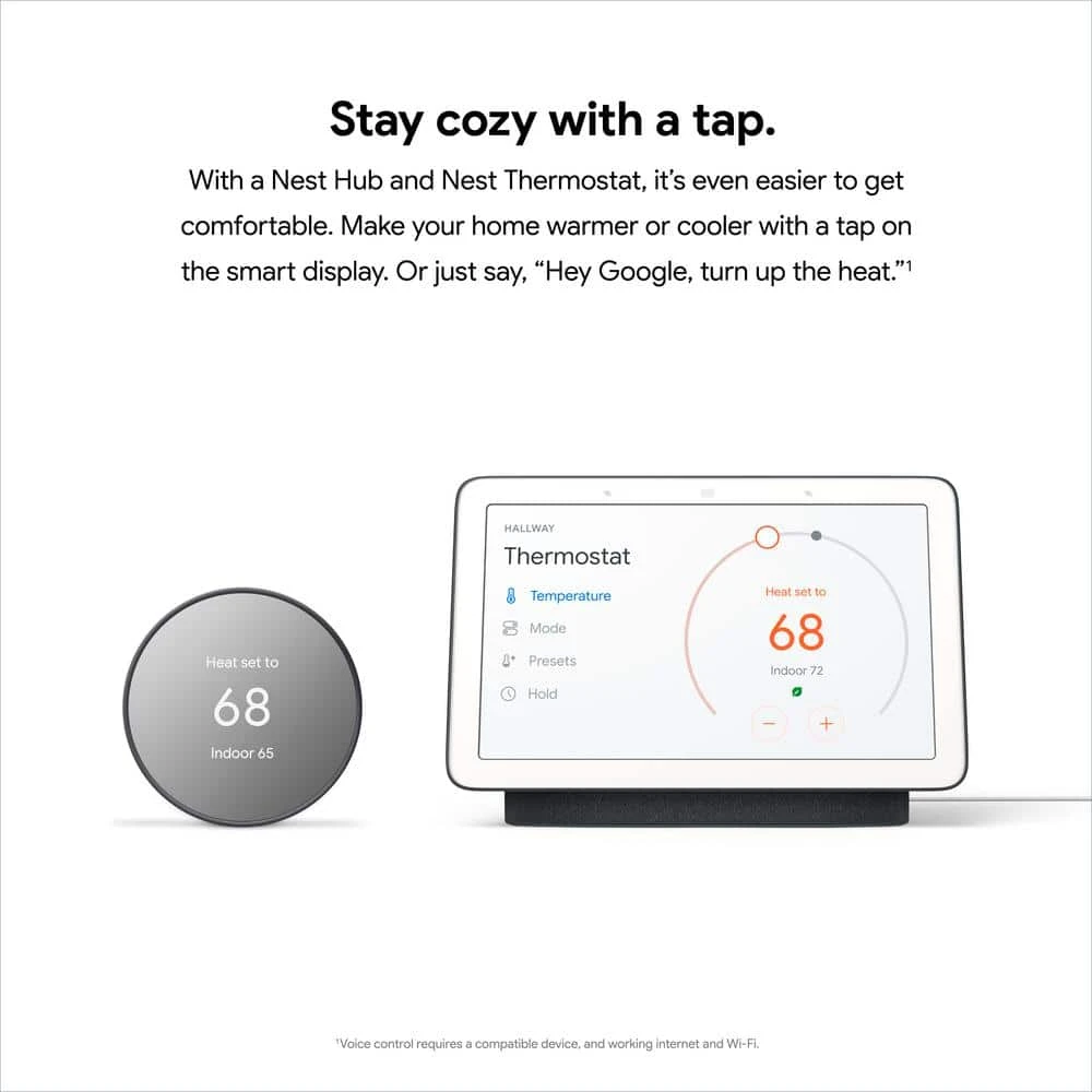 - Change the temperature with your voice – The Nest Thermostat works with Hey Google on your phone and Nest speakers and displays; It also works with Alexa on other smart devices